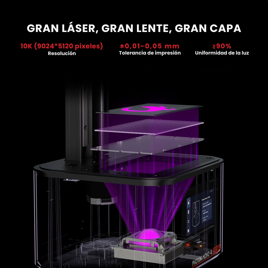 Resolución y Precisión: Con una resolución de pantalla de 9024 x 5120 píxeles y una resolución XY de 17 x 17 µm, el Photon Mono 4 Ultra mejora la precisión en un 105%. Esto permite revelar detalles impresionantes en las impresiones, garantizando resultados de alta calidad en cada proyecto.