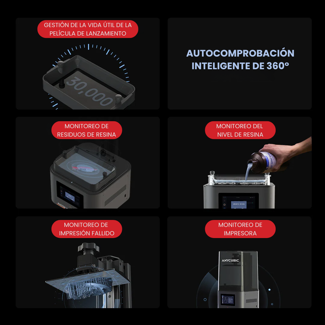 Sistemas de Asistencia Inteligentes: El Photon Mono 4 Ultra está equipado con sistemas de asistencia que garantizan un uso eficiente y seguro. La detección de errores en las impresiones, la monitorización de residuos de resina, y la verificación automática de la cantidad de resina antes de iniciar la impresión son solo algunas de sus características. Además, se realiza una autocomprobación rápida de los componentes y se gestiona la vida útil de la película de liberación, recordando su reemplazo después de un uso prolongado.