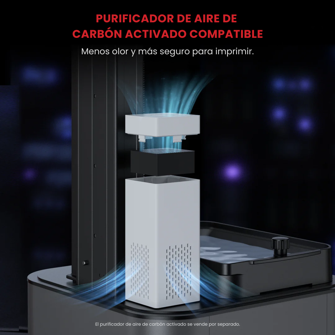 Facilidad de Uso y Accesorios Incluidos: La impresora se entrega ensamblada y precalibrada, lo que facilita su uso inmediato tras una simple nivelación de 4 puntos. Cuenta con una pantalla táctil HD de 4,3 pulgadas y se puede equipar con un purificador de aire de carbono activado para eliminar olores durante la impresión. En el paquete se incluyen todos los accesorios necesarios, como la plataforma de impresión, vat de resina, espátulas, guantes, y más, asegurando que el usuario tenga todo lo que necesita para comenzar a imprimir de inmediato.