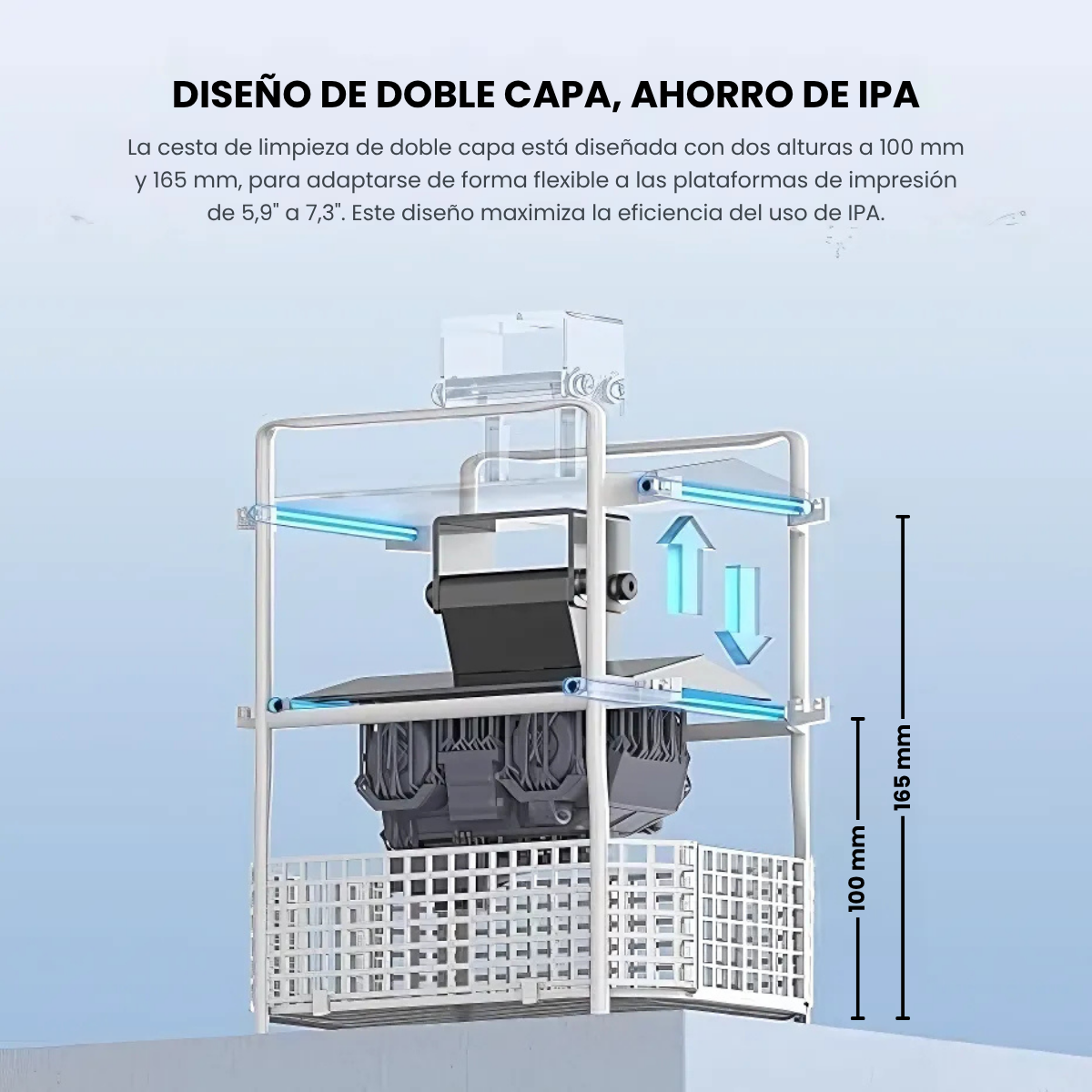 Diseño de doble capa: Cesta de limpieza de polipropileno (PP) de doble capa para una limpieza simultánea con la plataforma. Alturas ajustables (100 mm, 165 mm) que se adaptan a plataformas de 5.9″ a 7.3″. Uso eficiente de IPA optimizado.