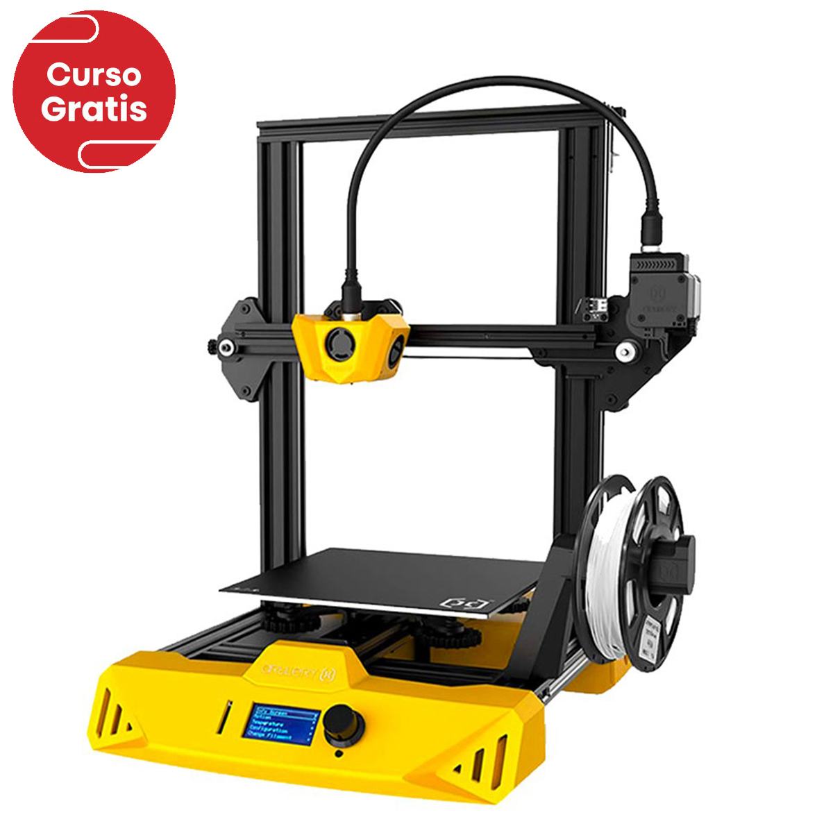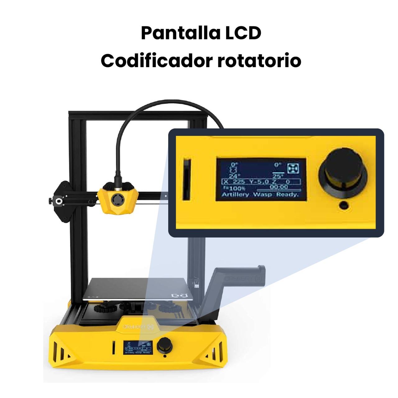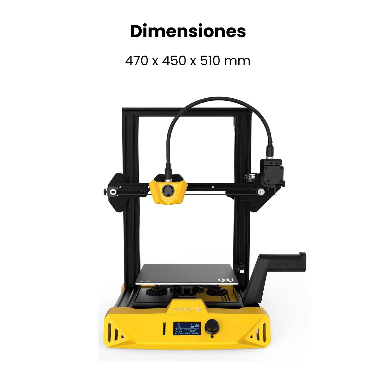 Este equipo amarillo de aspecto moderno es el nuevo Artillery Hornet, la tercera impresora 3D que sale bajo el nombre de Artillery. No solo se ve genial y elegante, sino que también incluye algunas características interesantes en ese pequeño cuerpo brillante. Incluye un motor de eje Z montado en la parte superior, un nuevo soporte de filamento, conectores de aviación, y Artillery incluso ha desarrollado su propia placa base para este modelo. La pieza de tecnología más interesante que llama la atención con el Hornet es su placa base Artillery Ruby de 32 bits. Con la boquilla estándar equipada, calentará a la temperatura que le pidas en menos de tres minutos. Con 220 x 220 x 250 mm, el espacio de construcción de Artillery Hornet es el estandar para una impresora moderna. Como si todo esto fuera poco, el Hornet es uno de los equipos mas silenciosos del mercado dentro de su gama. Artillery define este modelo como Ultra Silencioso.