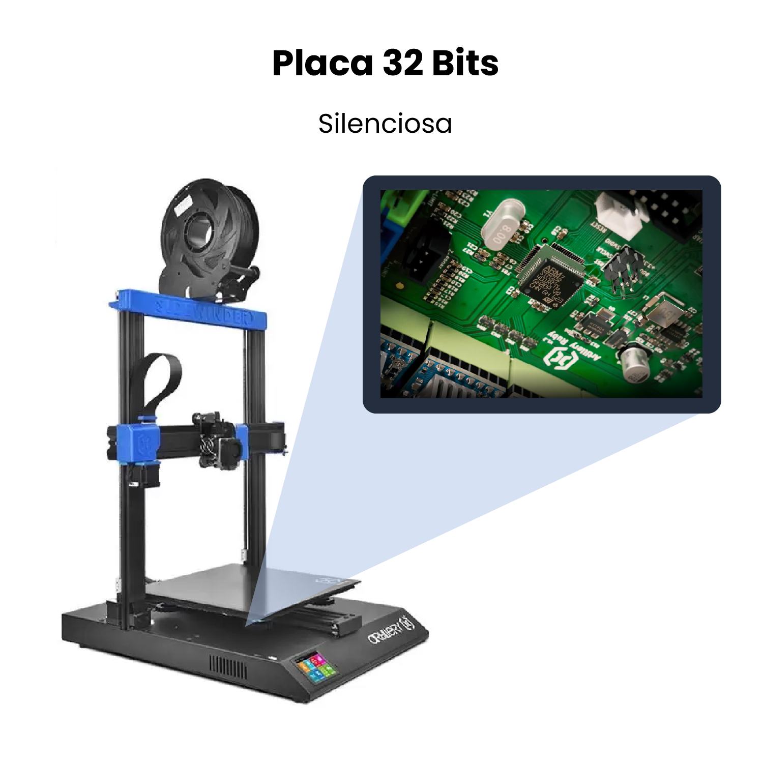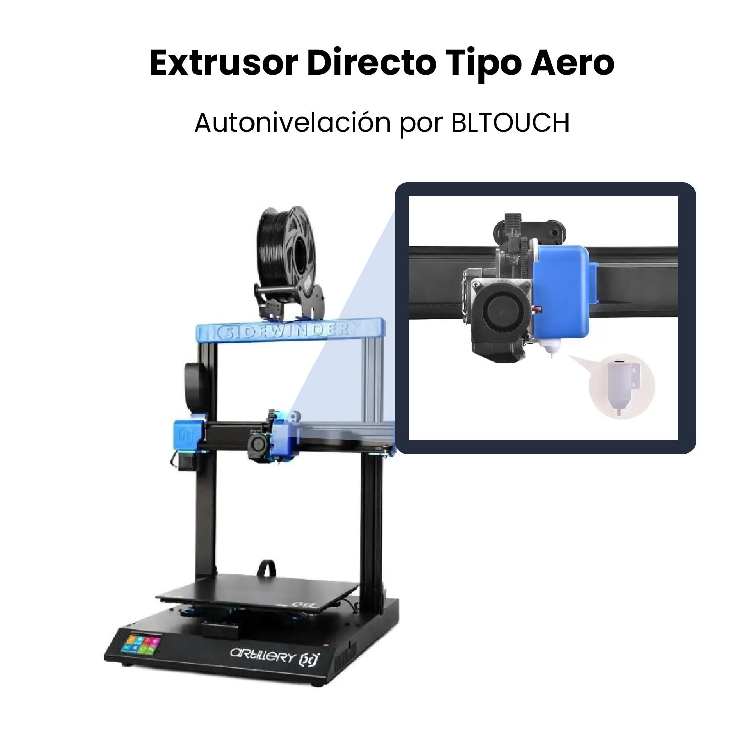 El modelo X2 Artillery se sigue apostando por la extrusión directa, con la que mejorará el control sobre el flujo de filamento. La extrusión directa también mejorará y facilitará la impresión de filamentos flexibles. X2 cuenta con la boquilla tipo Volcano, que nos permitirá imprimir más rápido manteniendo la misma calidad. A diferencia de su antecesora, la Artillery X2 posee cama de cerámica en vez de silicona, lo que conseguirá un calentamiento más rápido y uniforme en nuestra cama. La X2 mantiene la estructura rígida, estable y funcional, siendo también de tipo cartesiana. La Artillery X2 conserva la pantalla táctil de 3,5 pulgadas a todo color de su antecesora, gracias a la cual permitirá observar y modificar los parámetros de la impresión, así como ver el progreso de nuestra pieza. Calibración automática. Una de las mejoras que incluye esta impresora 3D es el BL Touch, un sistema de calibrado automático, ahorrará mucho tiempo a la hora de calibrar la impresora. La placa base incorporada es la Artillery Ruby 32 propia de la marca. Artillery desarrollo la placa madre de 32 bits Ruby 32 caracterizada por alta estabilidad, poderoso poder de computación y gran expansibilidad.