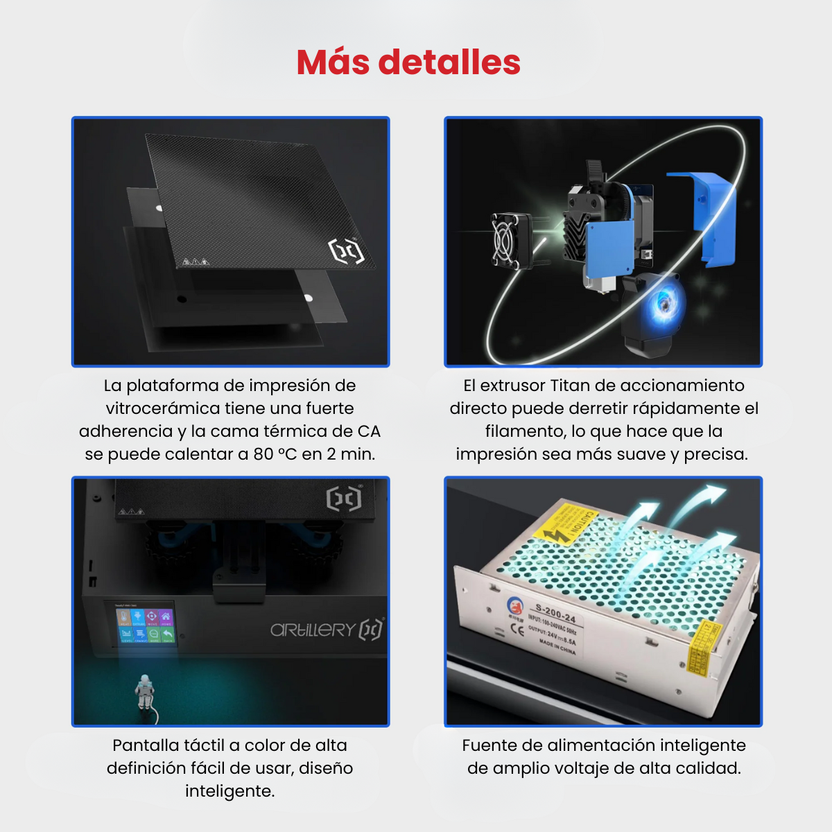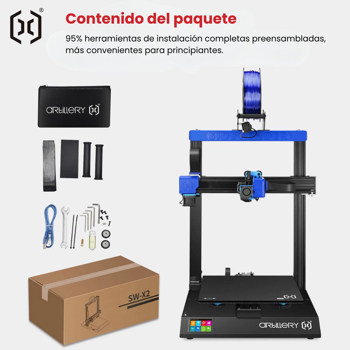 Materiales aceptados para imprimir: PLA, ABS, PET-G, Flexible, Madera, TPU, PVA, HIPS