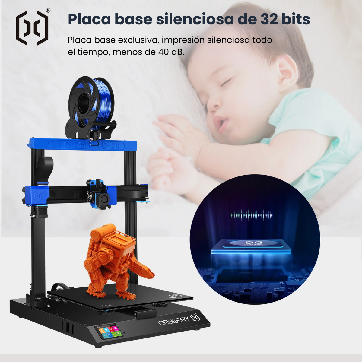 El modelo X2 Artillery se sigue apostando por la extrusión directa, con la que mejorará el control sobre el flujo de filamento. La extrusión directa también mejorará y facilitará la impresión de filamentos flexibles. X2 cuenta con la boquilla tipo Volcano, que nos permitirá imprimir más rápido manteniendo la misma calidad. A diferencia de su antecesora, la Artillery X2 posee cama de cerámica en vez de silicona, lo que conseguirá un calentamiento más rápido y uniforme en nuestra cama. La X2 mantiene la estructura rígida, estable y funcional, siendo también de tipo cartesiana. La Artillery X2 conserva la pantalla táctil de 3,5 pulgadas a todo color de su antecesora, gracias a la cual permitirá observar y modificar los parámetros de la impresión, así como ver el progreso de nuestra pieza. Calibración automática. Una de las mejoras que incluye esta impresora 3D es el BL Touch, un sistema de calibrado automático, ahorrará mucho tiempo a la hora de calibrar la impresora. La placa base incorporada es la Artillery Ruby 32 propia de la marca. Artillery desarrollo la placa madre de 32 bits Ruby 32 caracterizada por alta estabilidad, poderoso poder de computación y gran expansibilidad.