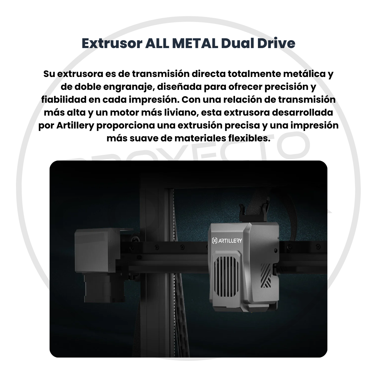 Extrusor ALL METAL Dual Drive: Su extrusora es de transmisión directa totalmente metálica y de doble engranaje, diseñada para ofrecer precisión y fiabilidad en cada impresión. Con una relación de transmisión más alta y un motor más liviano, esta extrusora desarrollada por Artillery proporciona una extrusión precisa y una impresión más suave de materiales flexibles.