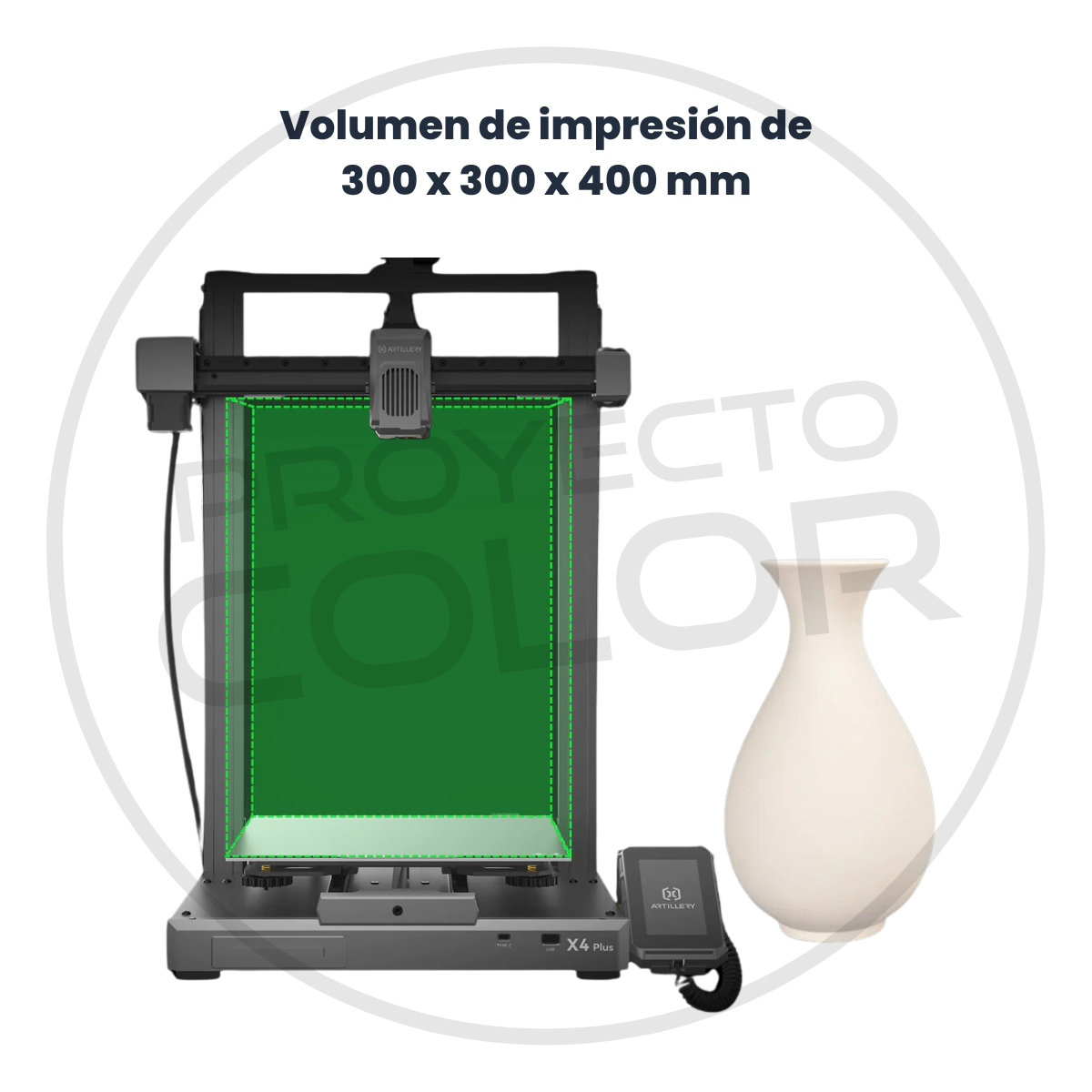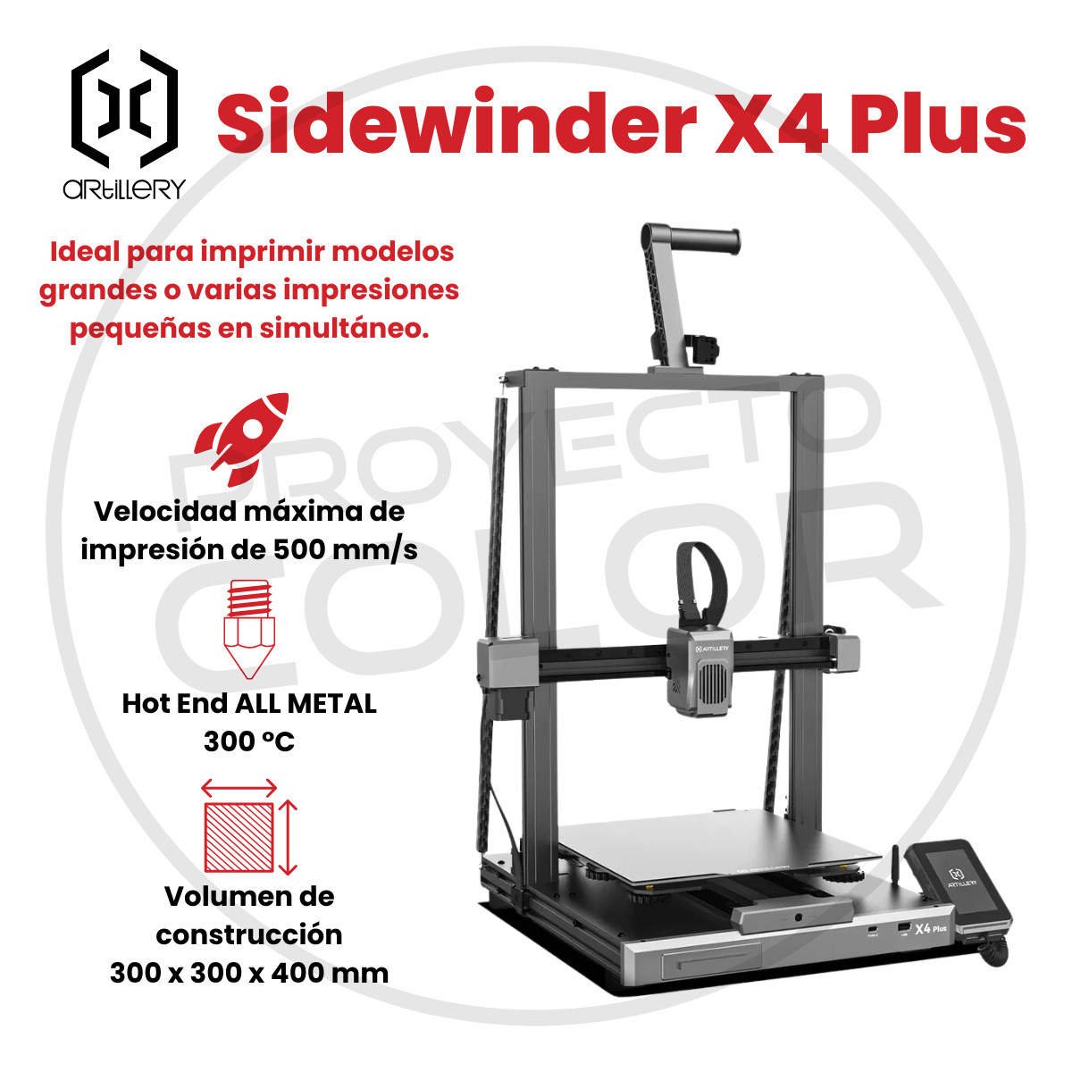 La impresora 3D Artillery Sidewinder X4 Plus S1, cuenta con un amplio volumen de impresión de 300 x 300 x 400 mm y una velocidad máxima de 500 mm/s, junto con una aceleración de 12,000 mm/s², garantiza resultados rápidos y de alta calidad en cada proyecto. Equipada con un extrusor Dual Gear Direct Drive y un hotend totalmente metálico que alcanza los 300°C, esta impresora 3D ofrece precisión y durabilidad. Además, cuenta con control remoto vía Wi-Fi, lo que permite un manejo sencillo y eficiente.