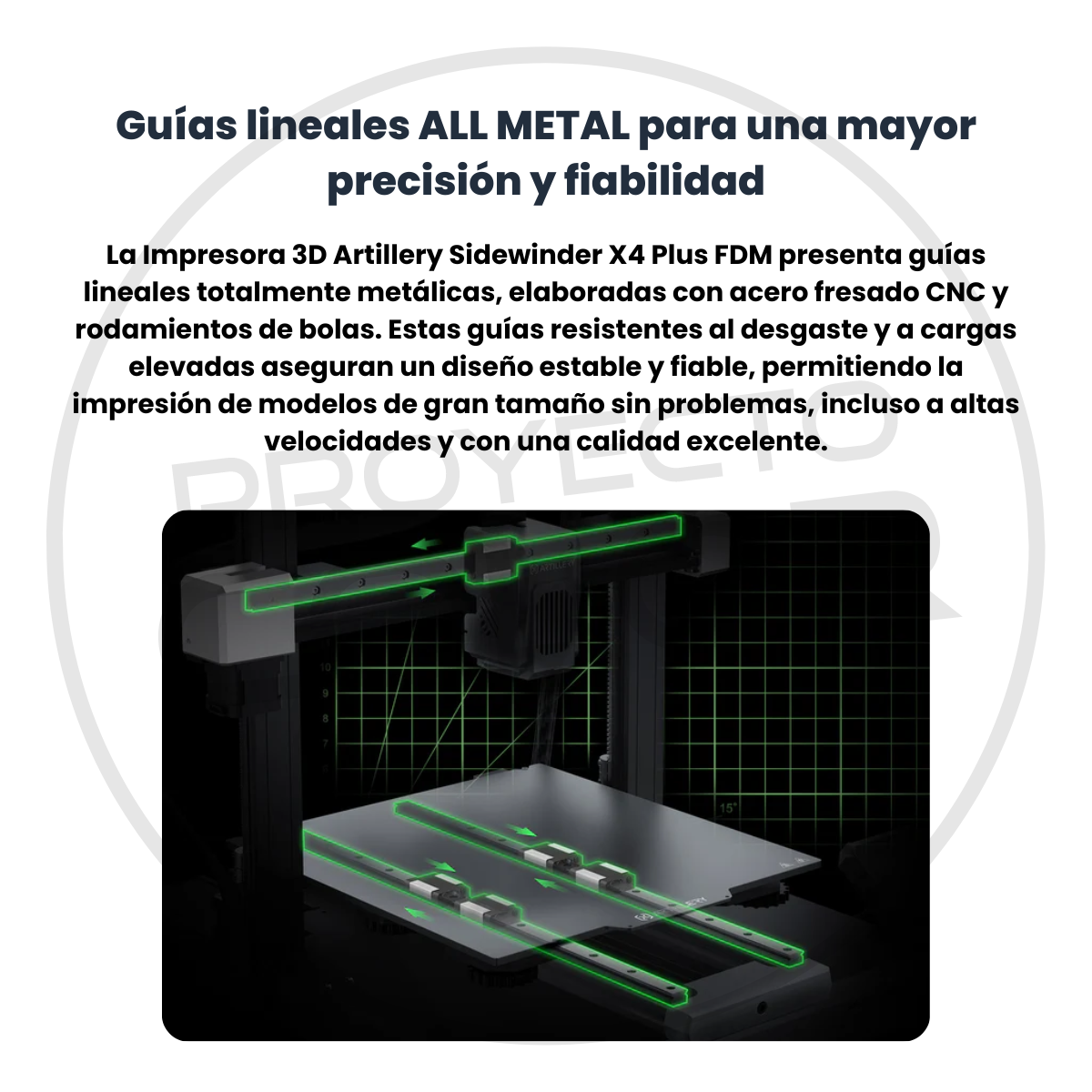Guías lineales ALL METAL para una mayor precisión y fiabilidad: La Impresora 3D Artillery Sidewinder X4 Plus FDM presenta guías lineales totalmente metálicas, elaboradas con acero fresado CNC y rodamientos de bolas. Estas guías resistentes al desgaste y a cargas elevadas aseguran un diseño estable y fiable, permitiendo la impresión de modelos de gran tamaño sin problemas, incluso a altas velocidades y con una calidad excelente.