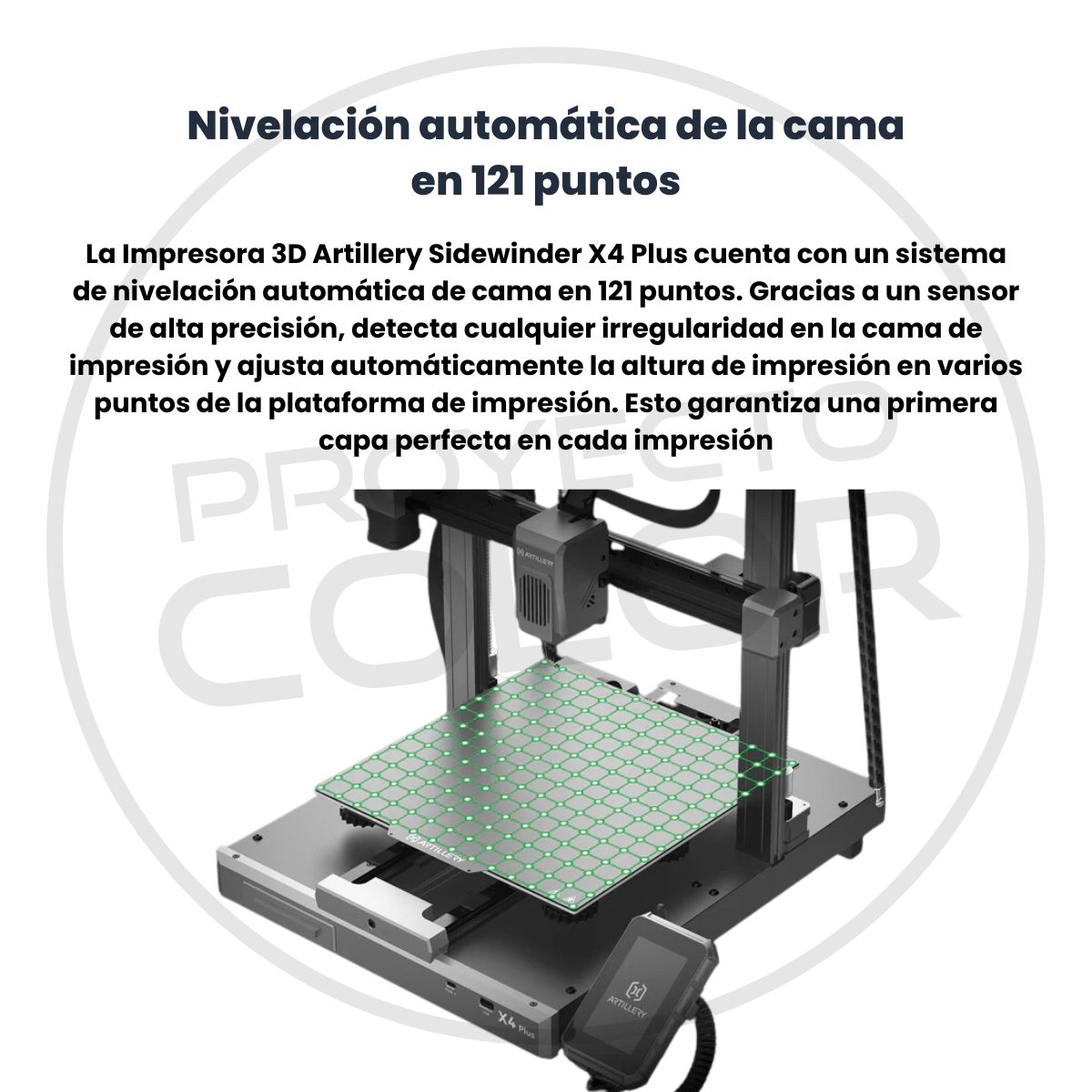 Nivelación automática de la cama en 121 puntos: La Impresora 3D Artillery Sidewinder X4 Plus cuenta con un sistema de nivelación automática de cama en 121 puntos. Gracias a un sensor de alta precisión, detecta cualquier irregularidad en la cama de impresión y ajusta automáticamente la altura de impresión en varios puntos de la plataforma de impresión. Esto garantiza una primera capa perfecta en cada impresión