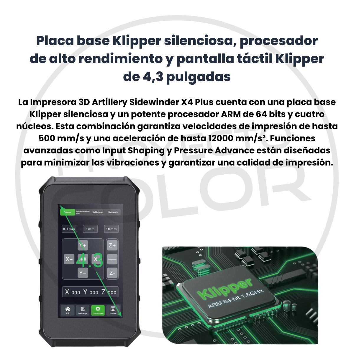 Placa base Klipper silenciosa, procesador de alto rendimiento y pantalla táctil Klipper de 4,3 pulgadas: La Impresora 3D Artillery Sidewinder X4 Plus cuenta con una placa base Klipper silenciosa y un potente procesador ARM de 64 bits y cuatro núcleos. Esta combinación garantiza velocidades de impresión de hasta 500 mm/s y una aceleración de hasta 12000 mm/s². Funciones avanzadas como Input Shaping y Pressure Advance están diseñadas para minimizar las vibraciones y garantizar una calidad de impresión.