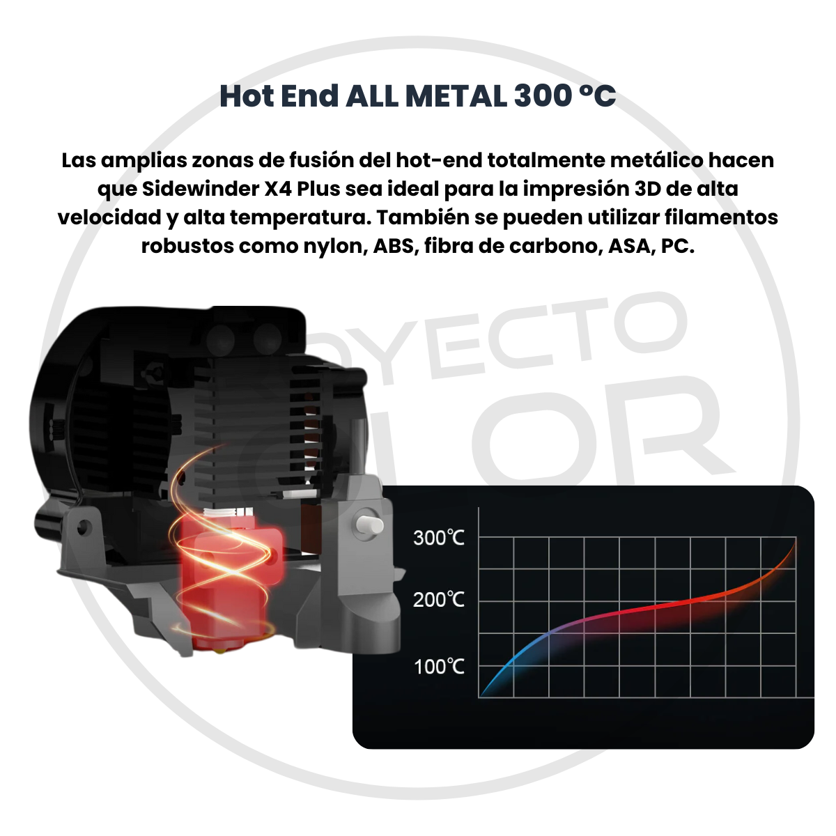 Hot End ALL METAL 300 °C: Las amplias zonas de fusión del hot-end totalmente metálico hacen que Sidewinder X4 Plus sea ideal para la impresión 3D de alta velocidad y alta temperatura. También se pueden utilizar filamentos robustos como nylon, ABS, fibra de carbono, ASA, PC.