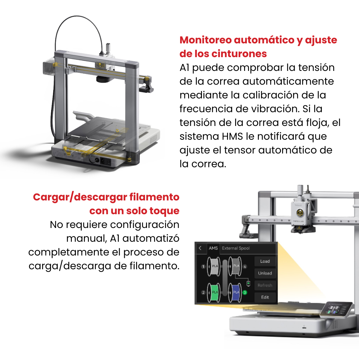 - Características diferenciales: Opción de Imprimir multicolor, calibración completamente automática, precisión de alta velocidad 10000 mm/s² aceleración, imprima en silencio 48 dB, A1 automatizó completamente el proceso de carga/descarga, boquillas de intercambio rápido, calidad coreXY.
