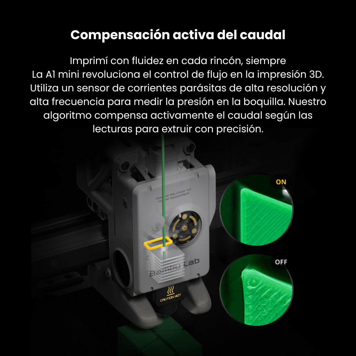 - Compensación Activa de la Tasa de Flujo: El A1 mini revoluciona el control de flujo en la impresión 3D. Utiliza un sensor de corrientes de Foucault de alta resolución y alta frecuencia para medir la presión en la boquilla en tiempo real. Nuestro algoritmo compensa activamente la tasa de flujo según las lecturas para extruir con precisión.