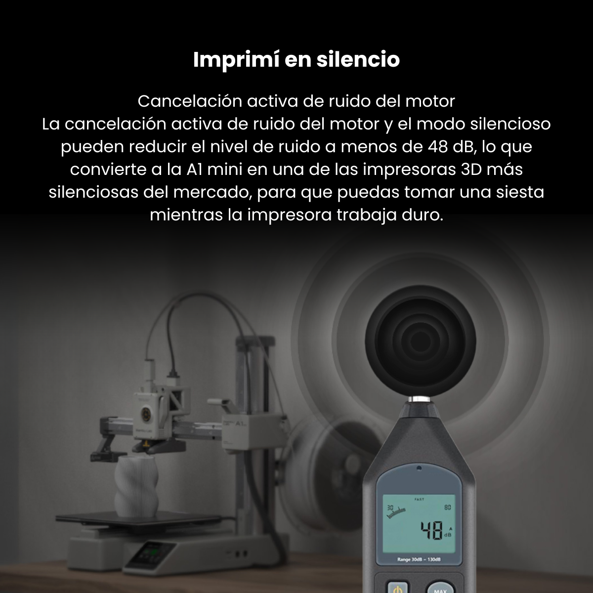 - Cancelación Activa de Ruido del Motor: El A1 mini puede calibrar algoritmos para adaptarse a pequeñas diferencias individuales entre cada motor. Esto compensa la indeseada aspereza del ruido del motor.