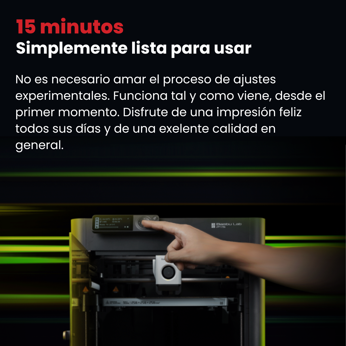 Al sacarlo de la caja, funciona sin necesidad de configuraciones complicadas. Con solo presionar un botón, la impresora se encargará de las calibraciones necesarias (nivelación automática de la cama y la compensación de vibraciones). - BAMBÚ RECINTO OFICIAL
