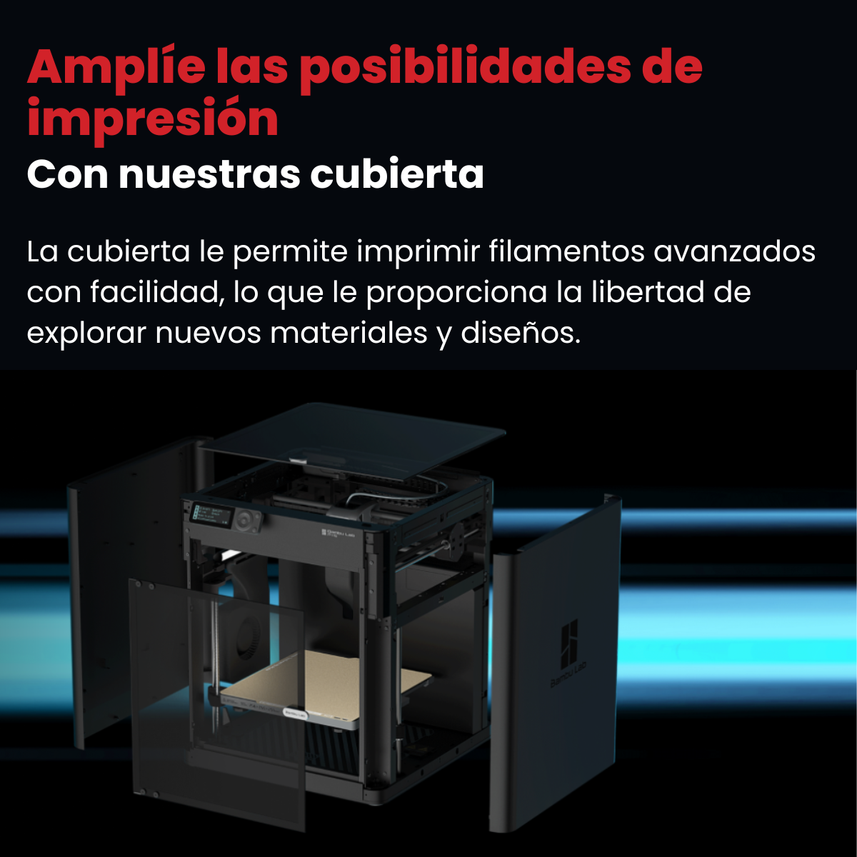 El recinto permite expandir las opciones de impresión, ya que la carcasa facilita la impresión de filamentos avanzados, lo que brinda la oportunidad de experimentar con distintos materiales y diseños. - ACELERACIÓN DE HASTA 20000 MM/S²
