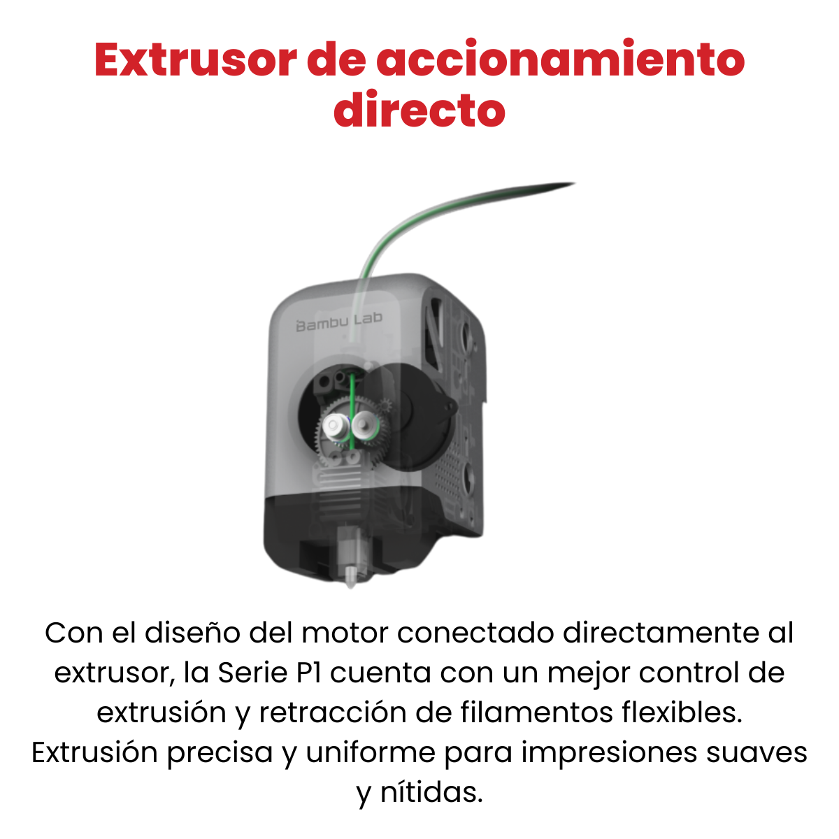La serie P1 cuenta con una extrusora de accionamiento directo que permite un mayor control sobre la extrusión y retracción de filamentos flexibles. Gracias a su diseño, en el que el motor está conectado directamente a la extrusora, se obtiene una extrusión precisa y consistente, lo que se traduce en impresiones suaves y sin borrosidad. - PRIMERA CAPA PERFECTA