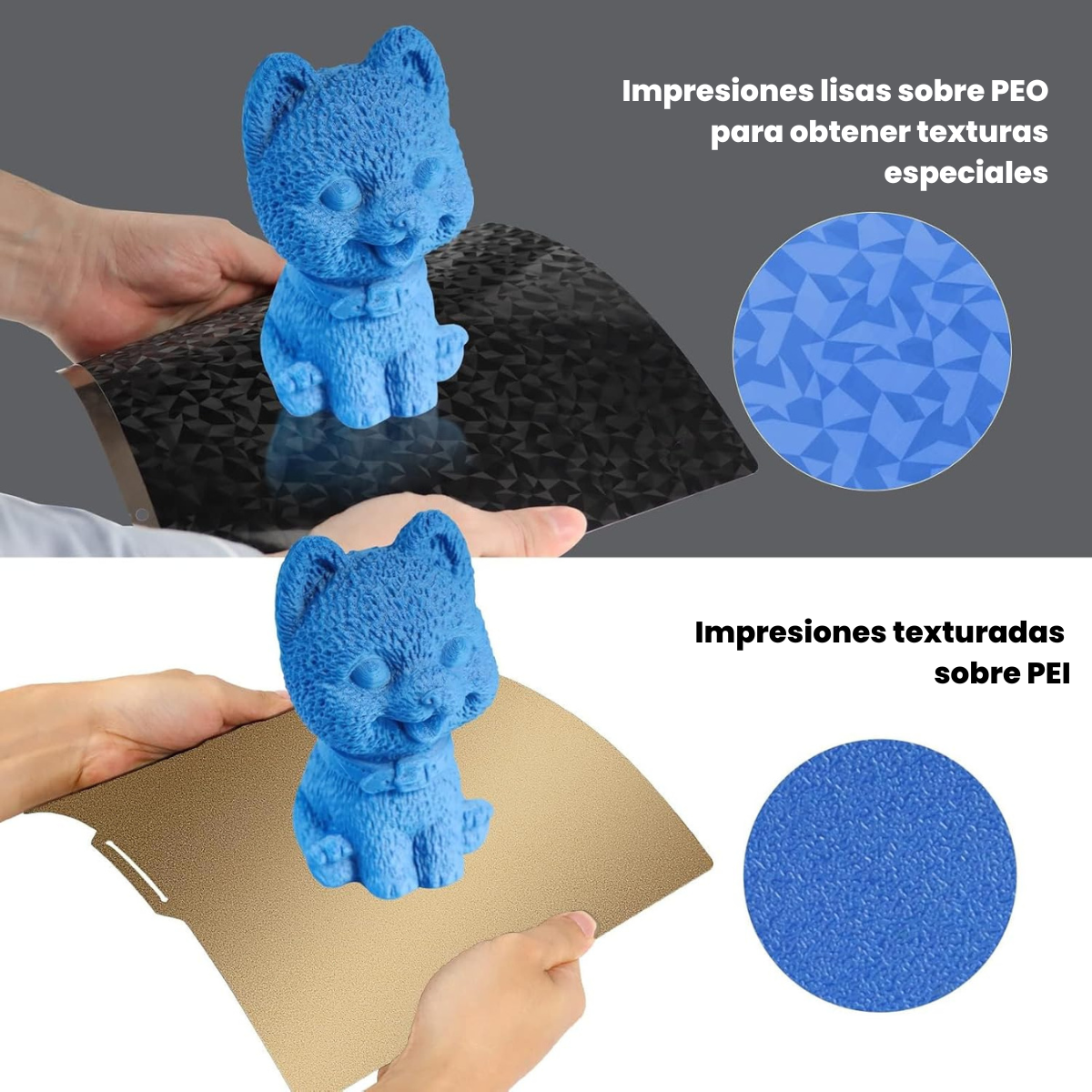 - Doble cara: Una cara de PEO (Polietileno Oxidado) que brinda mayor resistencia a las altas temperaturas y desgaste, y otra de PEI (Polieterimida) que proporciona una adherencia superior para una variedad de filamentos como PLA, ABS, PETG, entre otros.