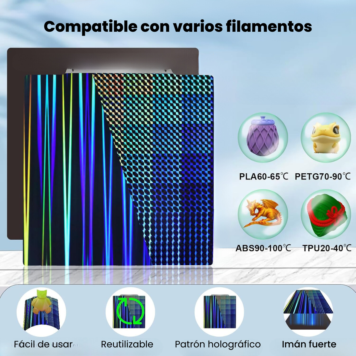 - Diseño atractivo: Los efectos holográficos no solo mejoran la funcionalidad, sino que también añaden un toque visual único a tu impresora 3D.