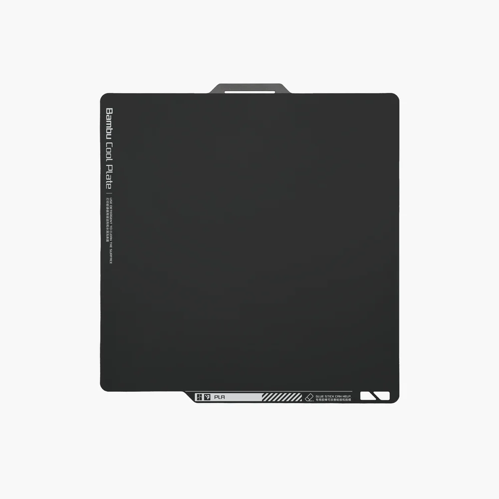 - Bambu Cool Plate es una pegatina que se aplica a la Bambu Engineering Plate. Esta es una superficie de impresión consumible que se usa junto con una fina capa de pegamento en barra y funciona mejor para filamentos con una baja temperatura de deflexión del calor.