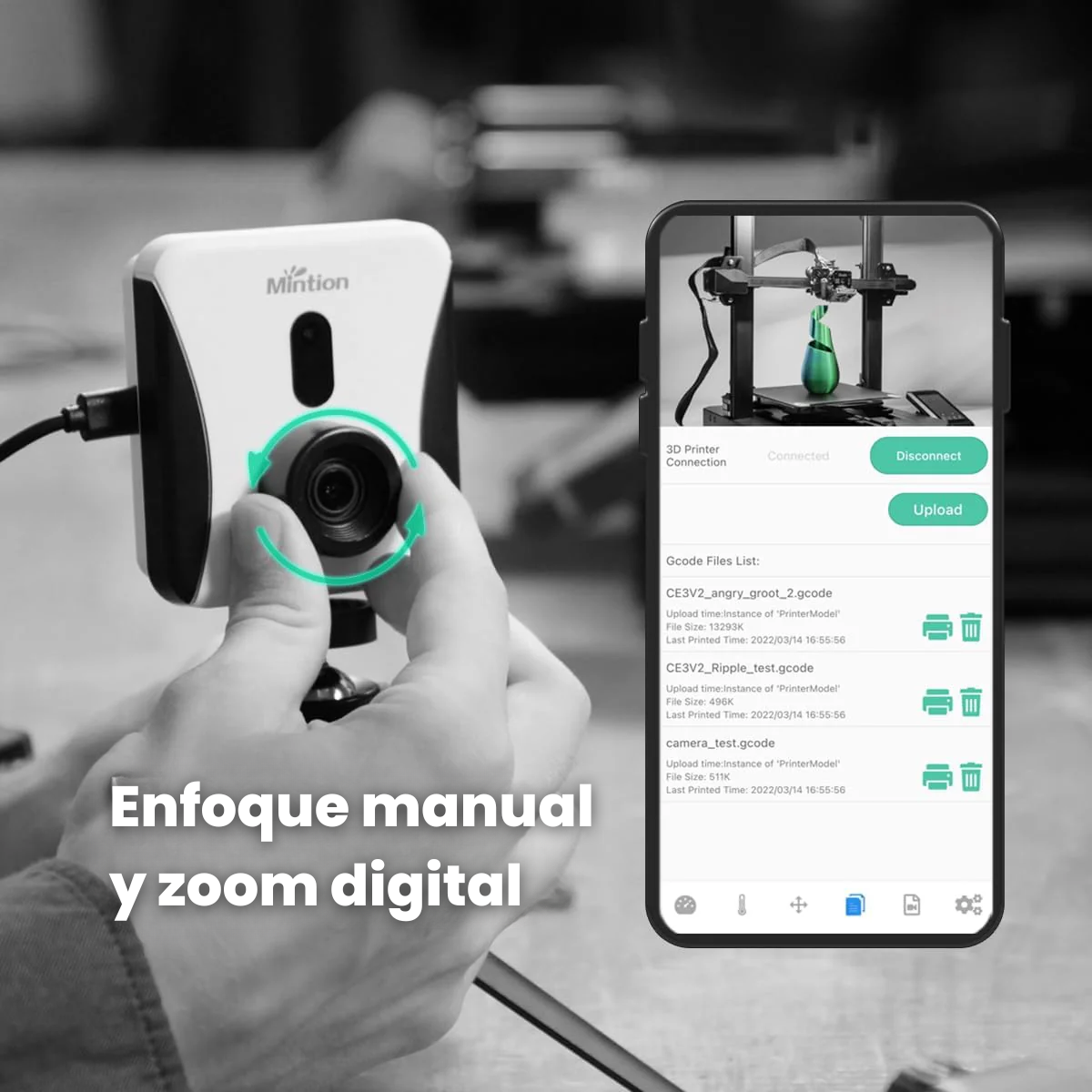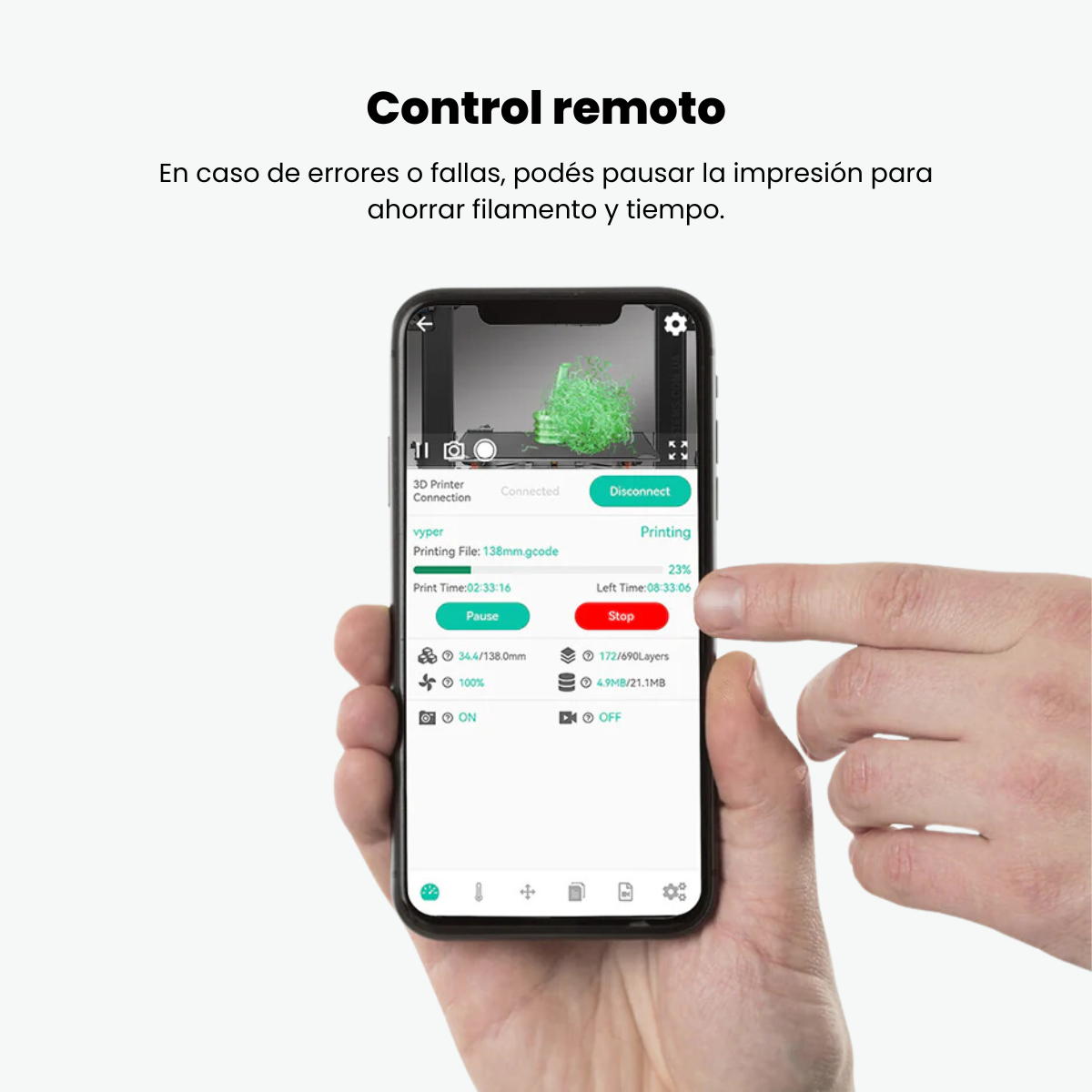 Si se produce una pausa o interrupción imprevista del proceso de impresión, la cámara te lo notificará a través de la app, en tiempo real. También se te informará a través de la aplicación cuando la impresión se haya completado.