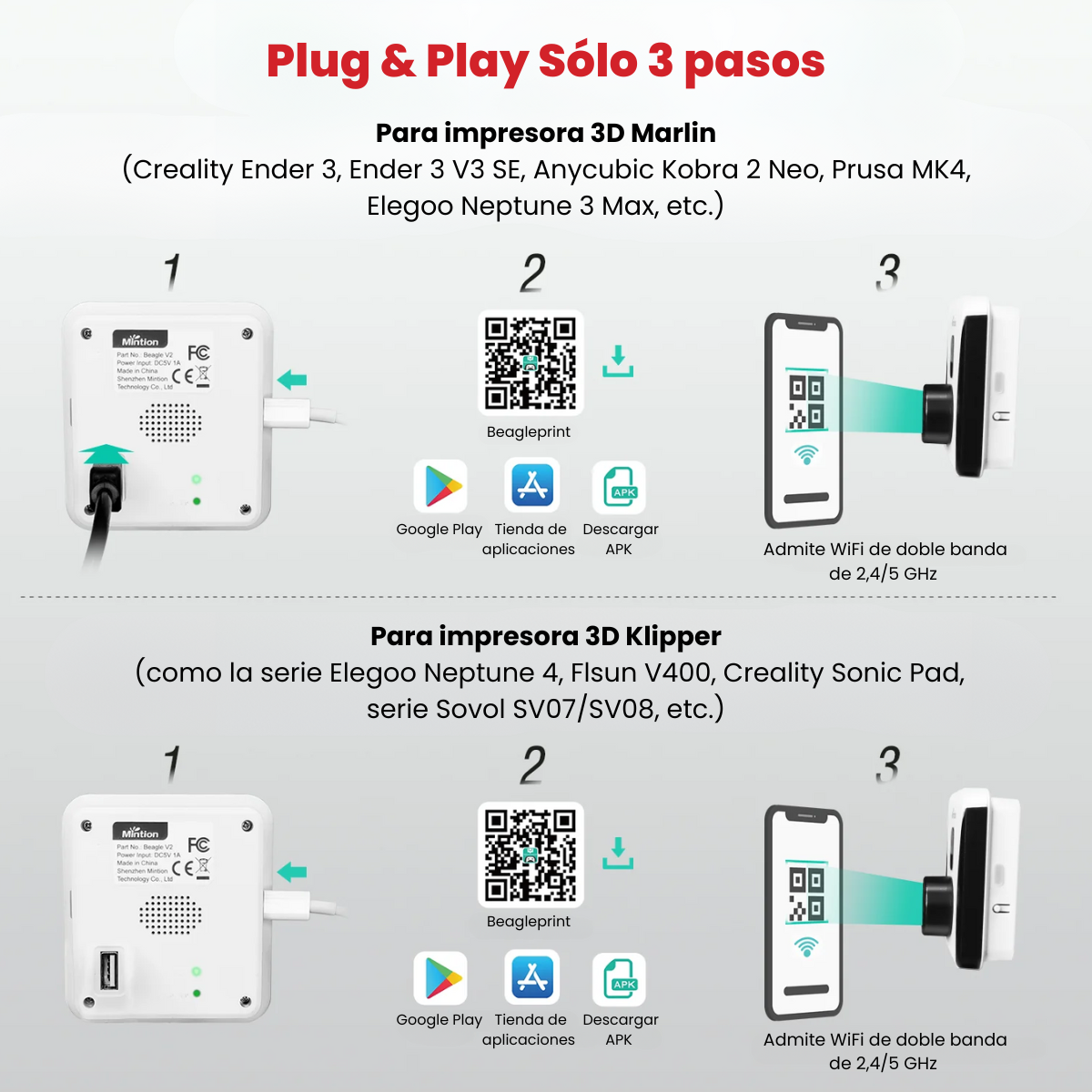 Beagle V2 es increíblemente fácil de usar. Conecta la cámara y la impresora 3D a la corriente, descarga la app Beagleprint y regístrate. Escanea el código para conectarte al Wi-Fi. Ya está