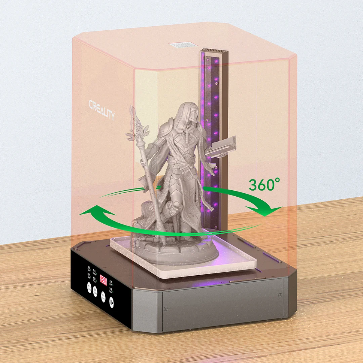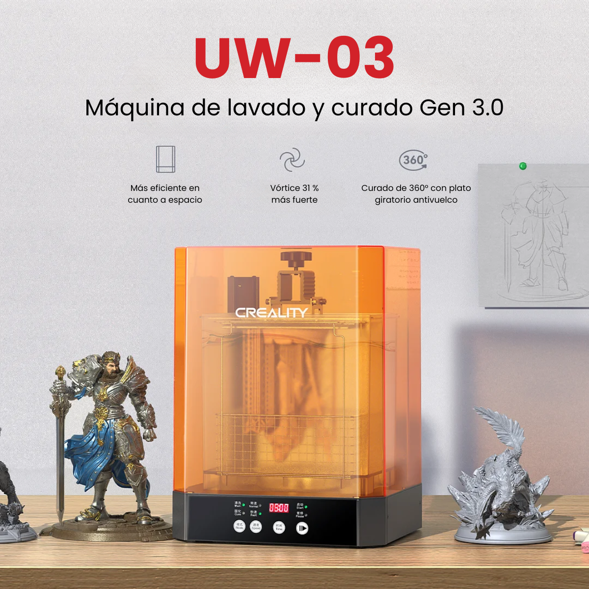 ¡Maquina de lavado y curado 2 en 1! Equipada con una hélice magnética de alta potencia que acelera el lavado un 31% más rápido que otras lavadoras. Su plataforma giratoria ofrece curado UV de 360° y permite tratar modelos más grandes gracias a un espacio de curado de 215 x 165 x 300 mm y de lavado de 210 x 160 x 200 mm. Bloquea el 99,9% de los rayos UV y evita derrames. Sus controles intuitivos y sistema antivuelco aseguran una operación sencilla y estable.