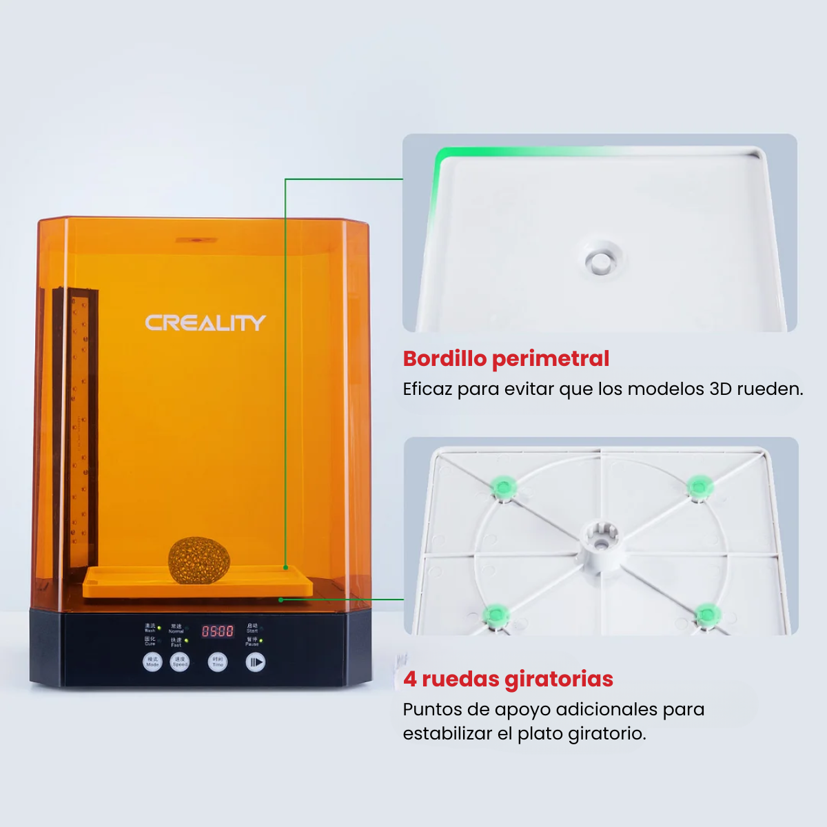 Los botones intuitivos te permiten ajustar la velocidad y el temporizador de lavado/curado en segundos, adaptándose a la resina, tamaño y complejidad del modelo.