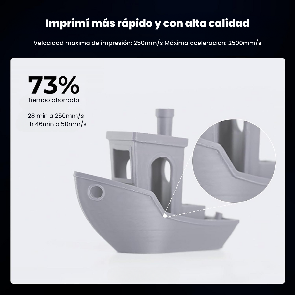 Imprima más rápido con una calidad loable: Velocidad máxima de impresión: 250 mm/s*; Aceleración máxima: 2500 mm/s²*