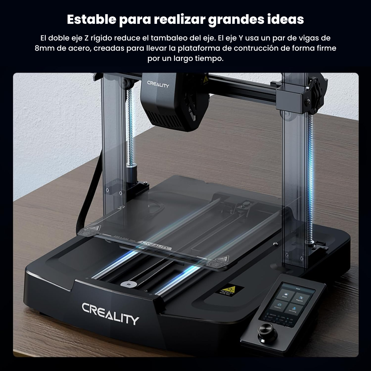 Estable para realizar grandes ideas: El doble eje Z rígido reduce la oscilación de Z. El eje Y utiliza un par de ejes lineales de 8 mm de espesor fabricados de acero resistente y resistente al desgaste, capaces de transportar la plataforma de construcción de manera constante durante un tiempo duradero. Juntos cuidarán bien de cada impresión.