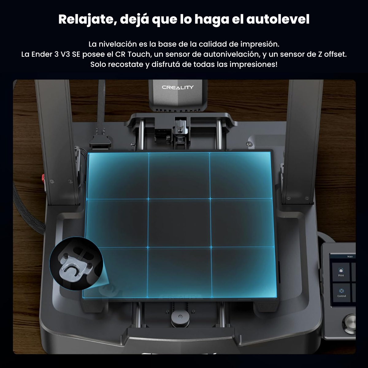 Relajáte, deja que la nivelación automática lo haga: La nivelación es la base de la calidad de impresión. Ender-3 V3 SE cuenta con un sensor CR Touch para nivelación automática y un sensor de tensión para compensación Z automática.
