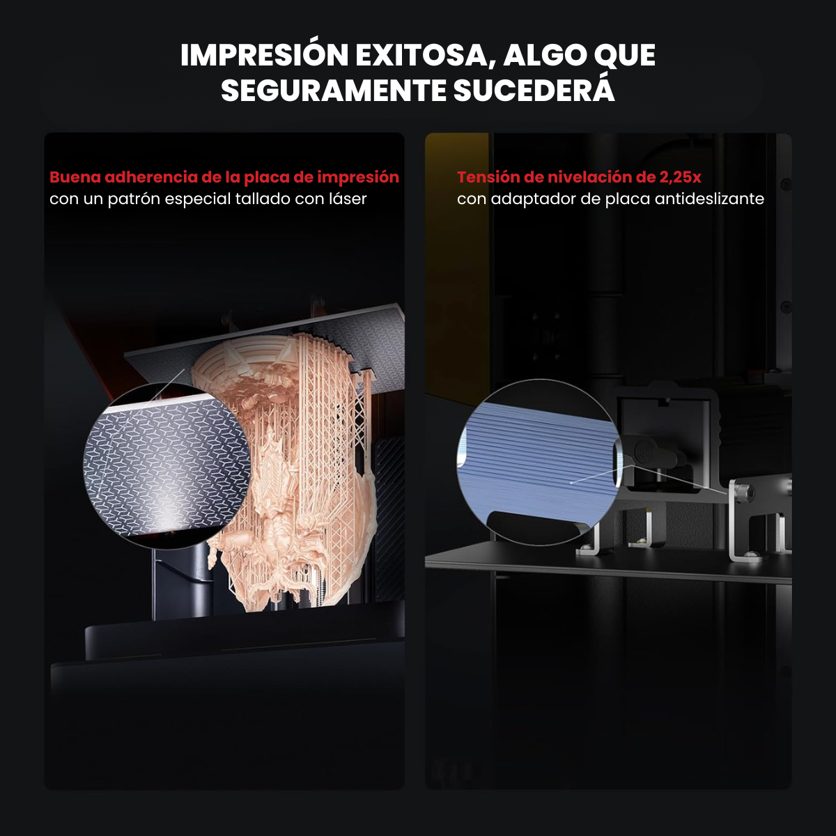Superficie de Impresión Avanzada: La HALOT-MAGE S cuenta con una cama de impresión de aleación de aluminio mecanizada por CNC para una primera capa uniforme. La superficie de la cama tiene un patrón especial tallado con láser, que garantiza una mayor adherenciay facilita el desprendimiento más rápido de los modelos.