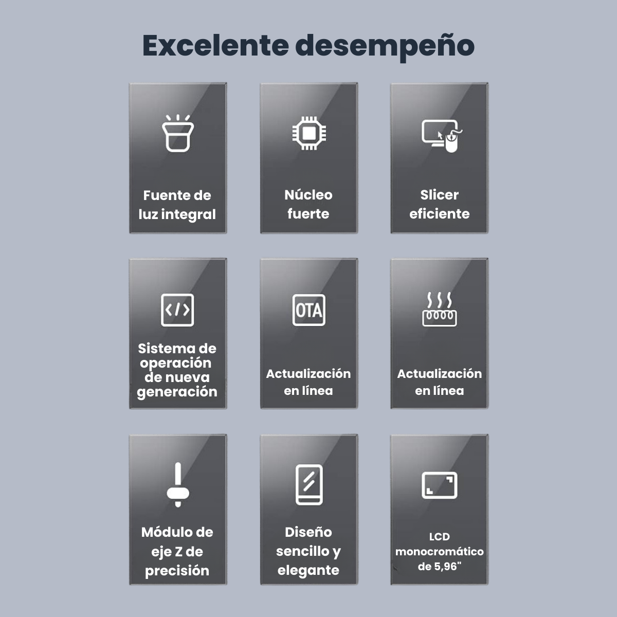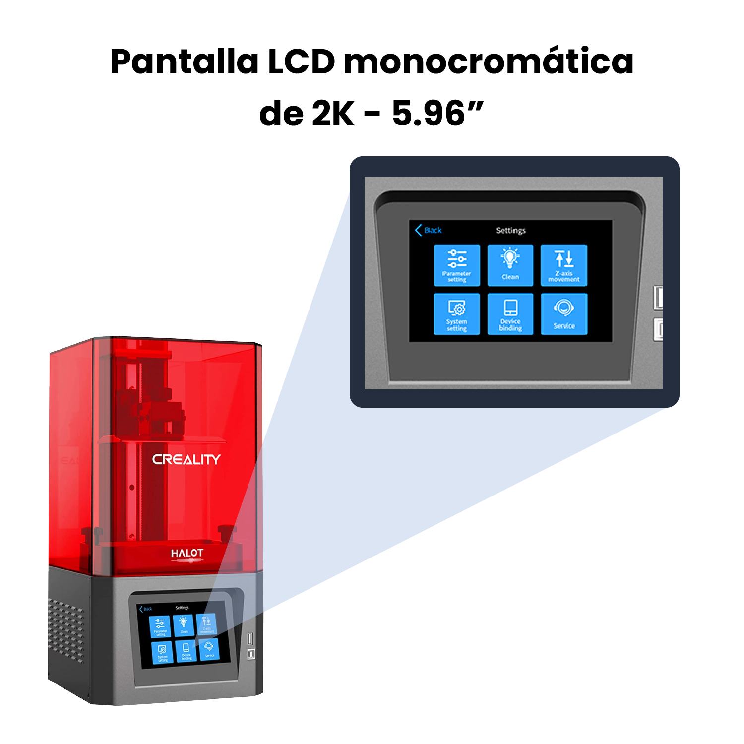 Pantalla LCD monocromática 2K de 6 pulgadas: La fuente de luz pasa a través de la pantalla LCD, y en el Halot-One, es monocromática de 6 pulgadas. Con una resolución de 2560 x 1620 píxeles, esto proporciona una granularidad de impresión de ~ 50 micrones. Esto significa que son posibles impresiones de excelente calidad.