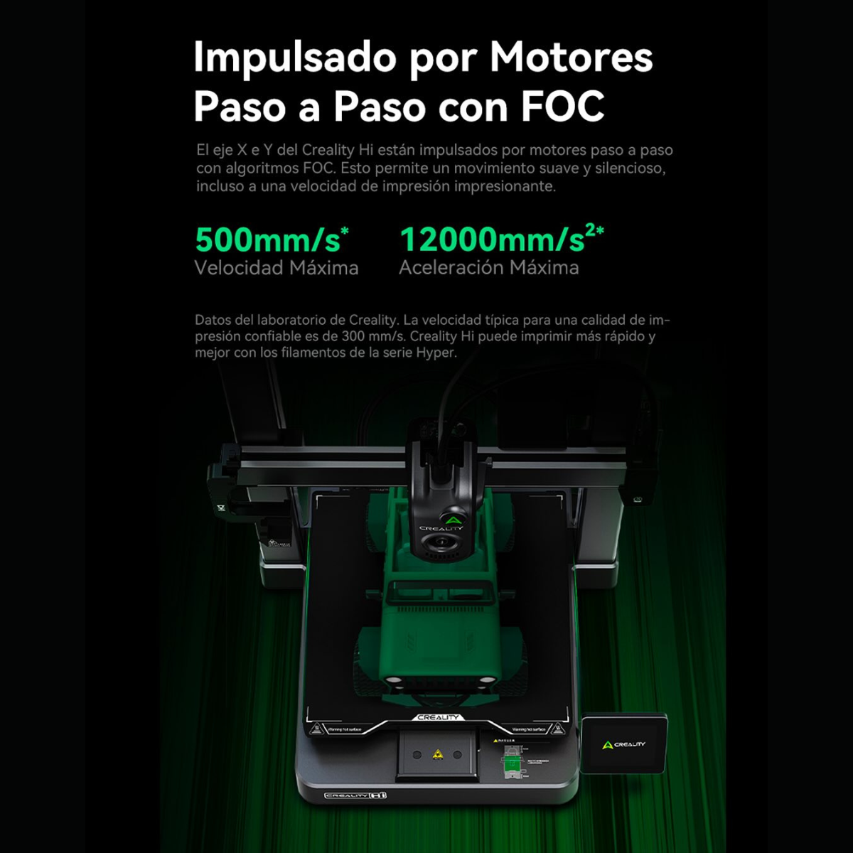 Impulsado por Motores Paso a Paso con FOC: El eje X e Y del Creality Hi están impulsados por motores paso a paso con algoritmos FOC. Esto permite un movimiento suave y silencioso, incluso a una velocidad de impresión impresionante.