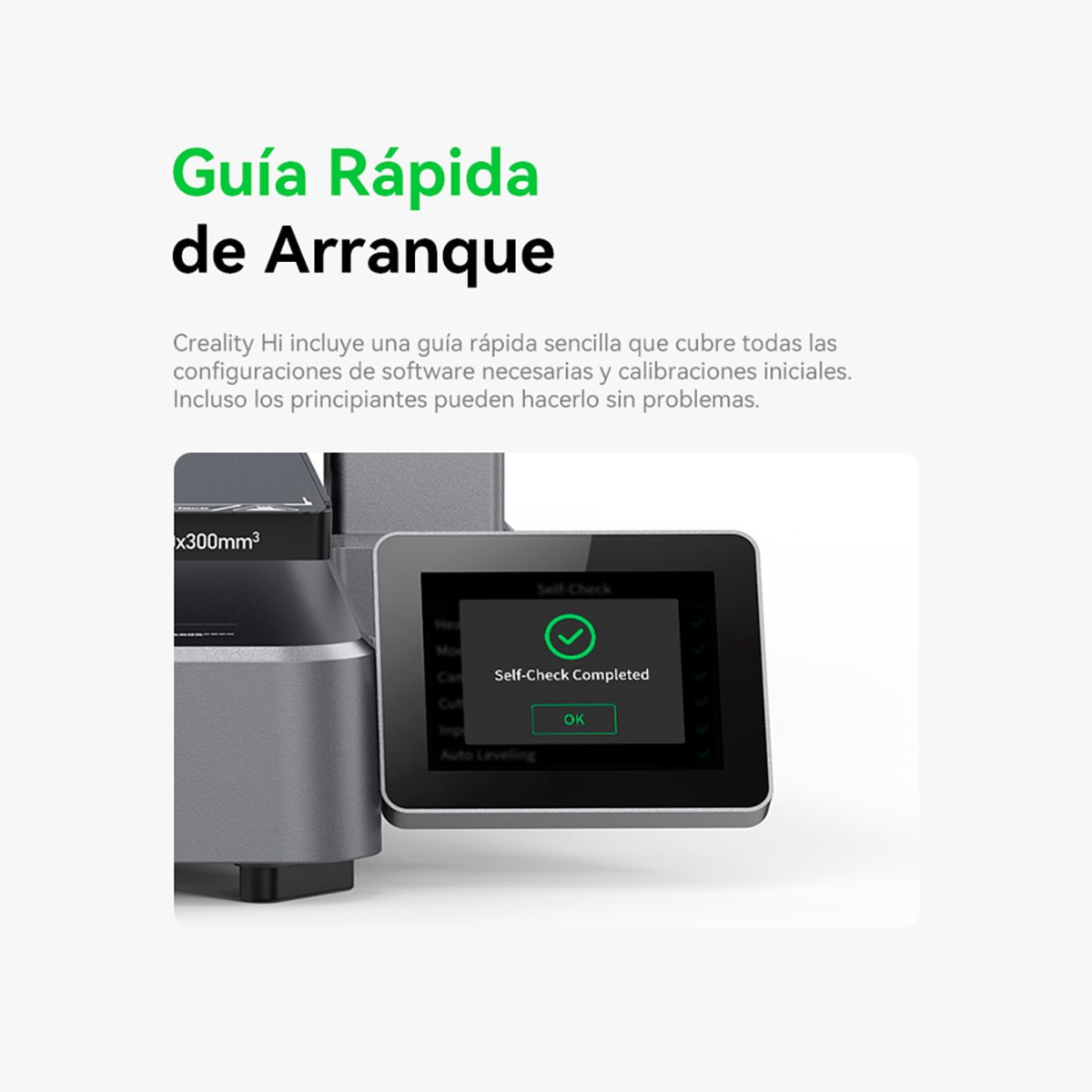 Guía rápida de arranque: Creality Hi incluye una guía rápida sencilla que cubre todas las configuraciones de software necesarias y calibraciones iniciales. Incluso los principiantes pueden hacerlo sin problemas.