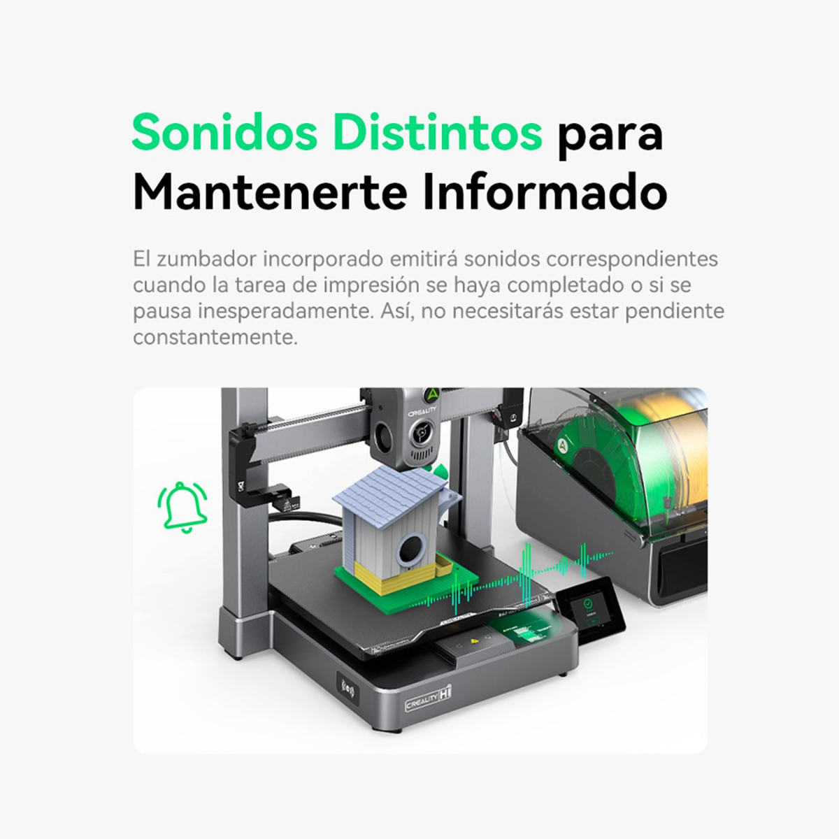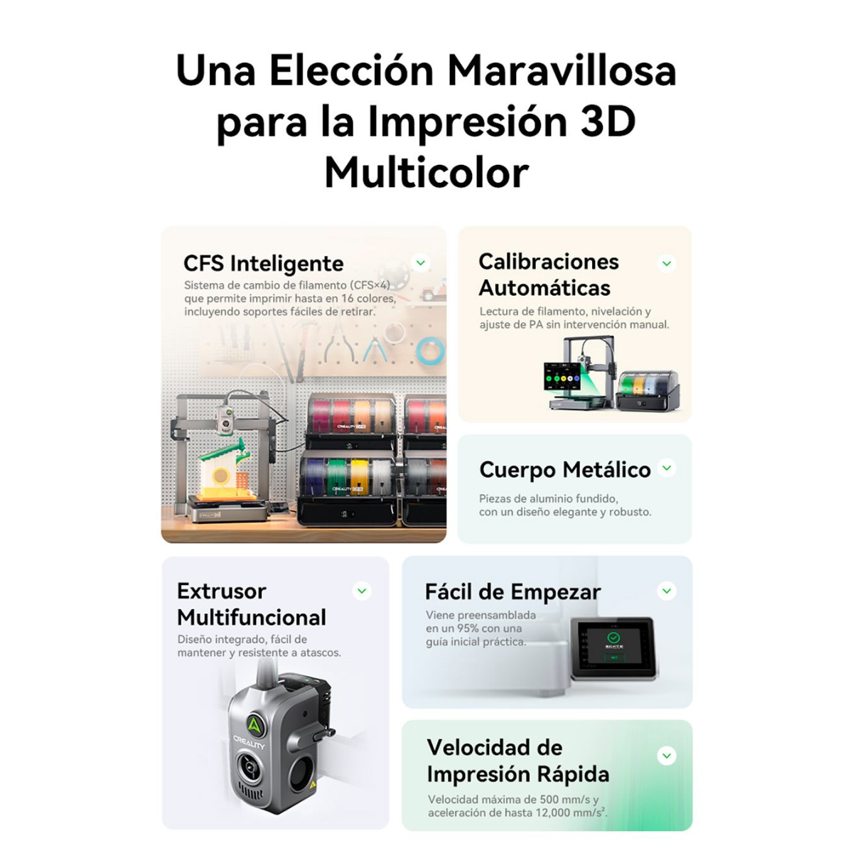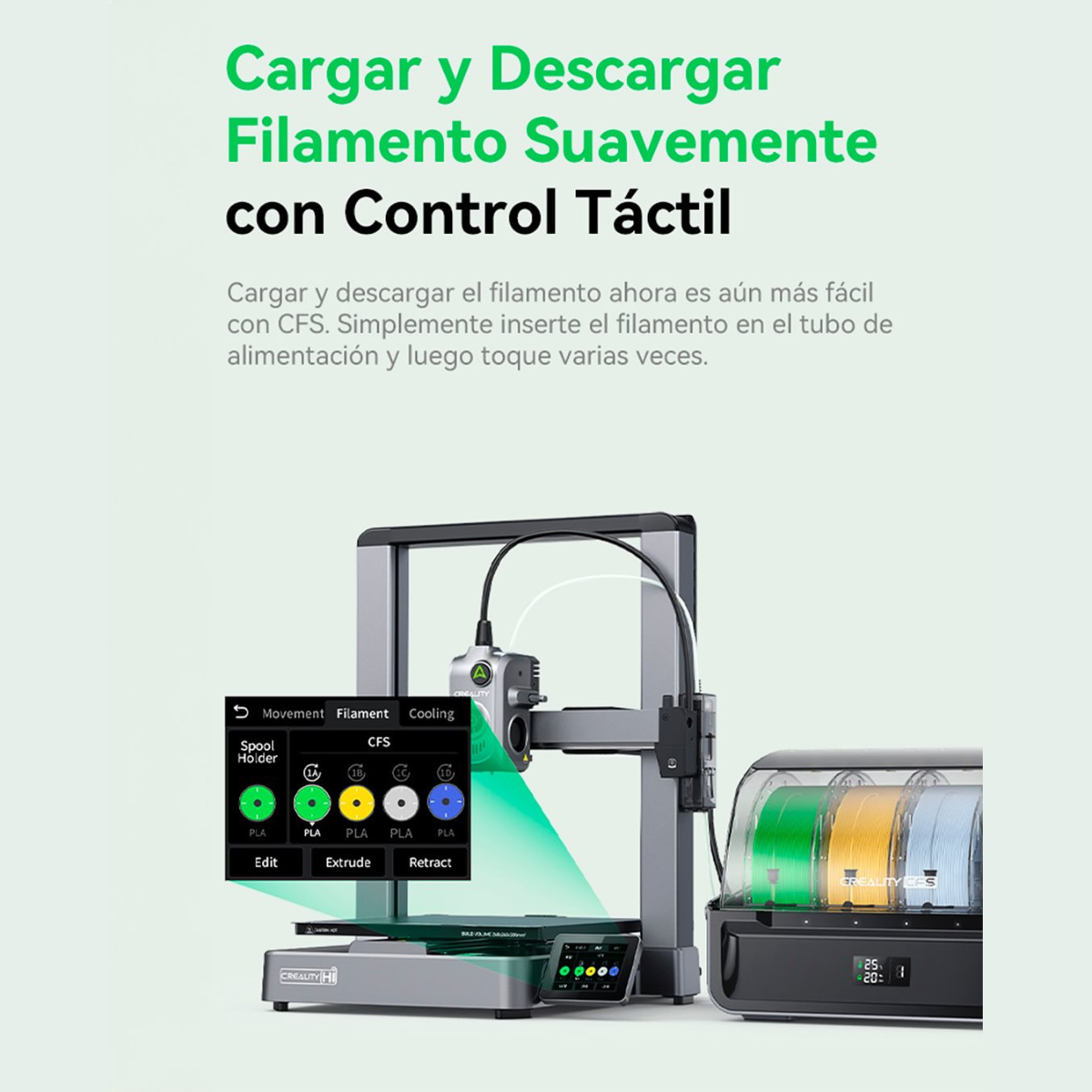La impresora Creality Hi ofrece una experiencia de impresión avanzada y sencilla. Con el sistema CFS Inteligente, podrás imprimir hasta en 16 colores sin retoques (Requiere 4 CFS, el equipo incluye 1), mientras que su calibración automática asegura precisión. Con un montaje fácil y rápido, pantalla táctil plegable y monitoreo de impresión mediante cámara, es perfecta para principiantes. Su estructura metálica y tecnología de reducción de ruido brindan estabilidad y silencio. Además, su software Creality OS optimiza el flujo de trabajo, con múltiples ajustes y acceso a la comunidad Creality Cloud. Ideal para proyectos 3D de alta calidad.