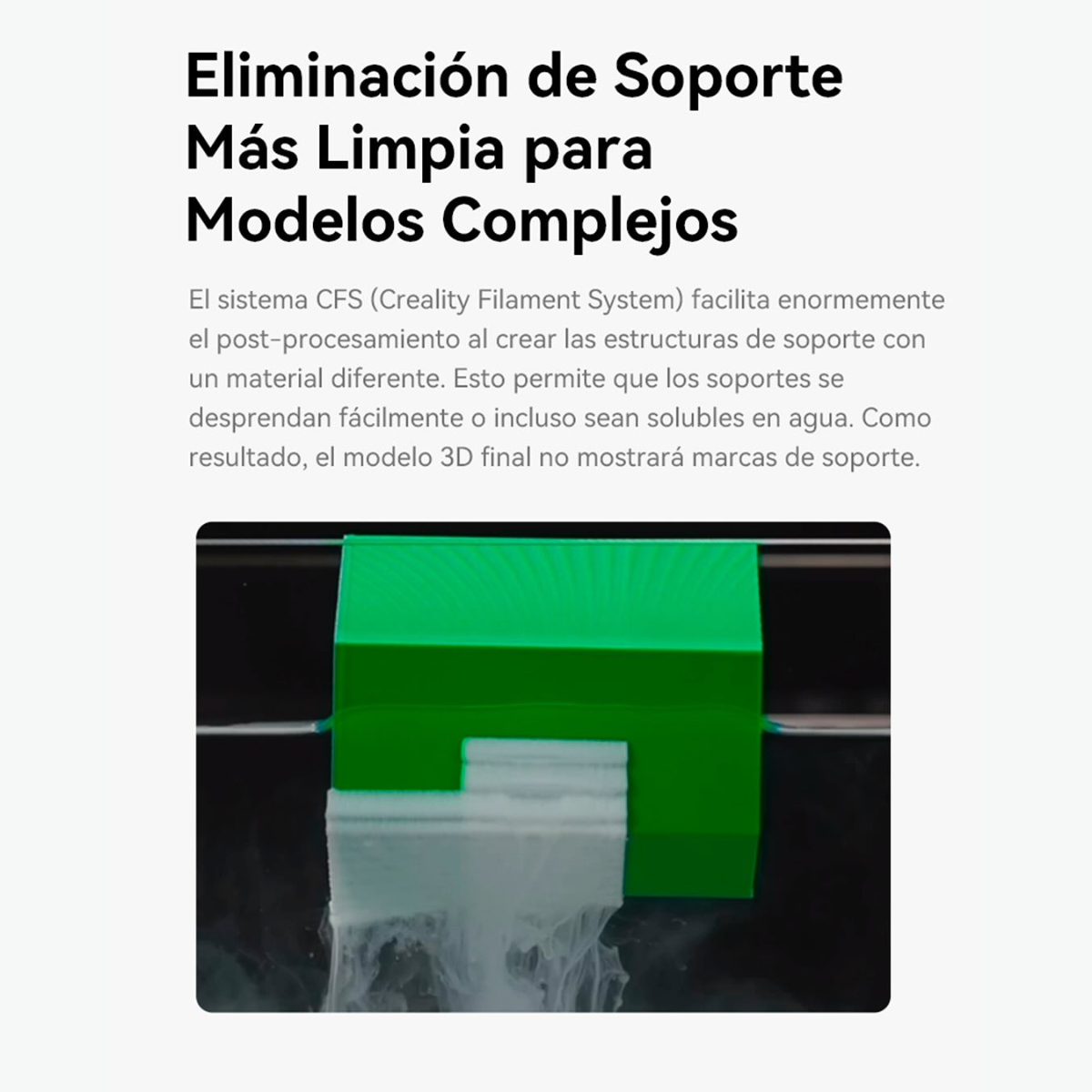 Eliminación de Soporte Más Limpia para Modelos Complejos: El sistema CFS (Creality Filament System) facilita enormemente el post-procesamiento al crear las estructuras de soporte con un material diferente. Esto permite que los soportes se desprendan fácilmente o incluso sean solubles en agua. Como resultado, el modelo 3D final no mostrará marcas de soporte.