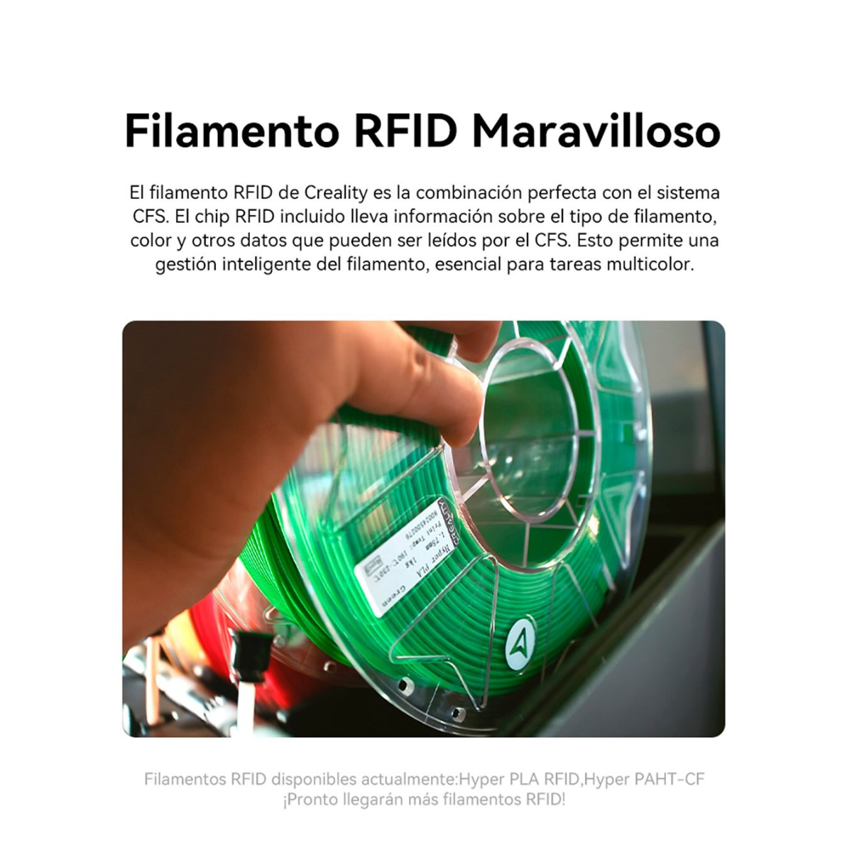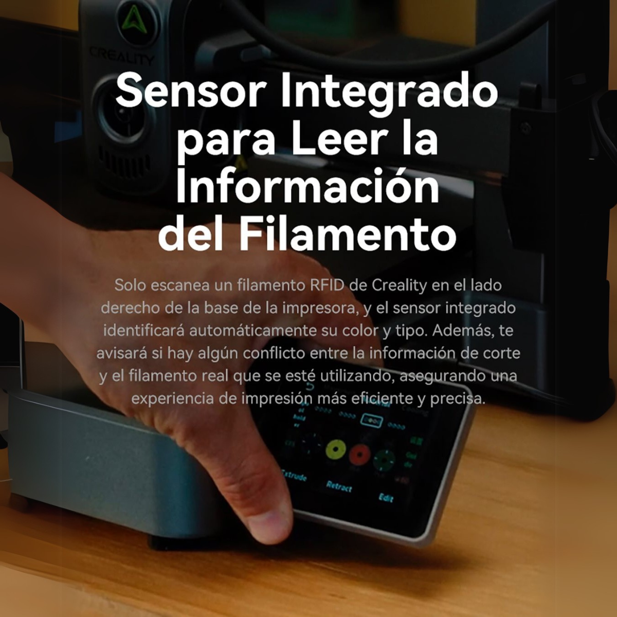 Calibraciones Automáticas: Solo escanea un filamento RFID de Creality en el lado derecho de la base de la impresora, y el sensor integrado identificará automáticamente su color y tipo. Además, te avisará si hay algún conflicto entre la información de corte y el filamento real que se esté utilizando, asegurando una experiencia de impresión más eficiente y precisa.