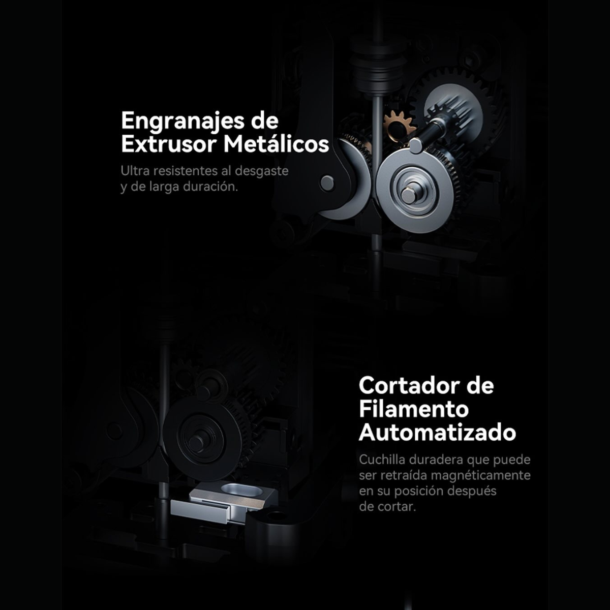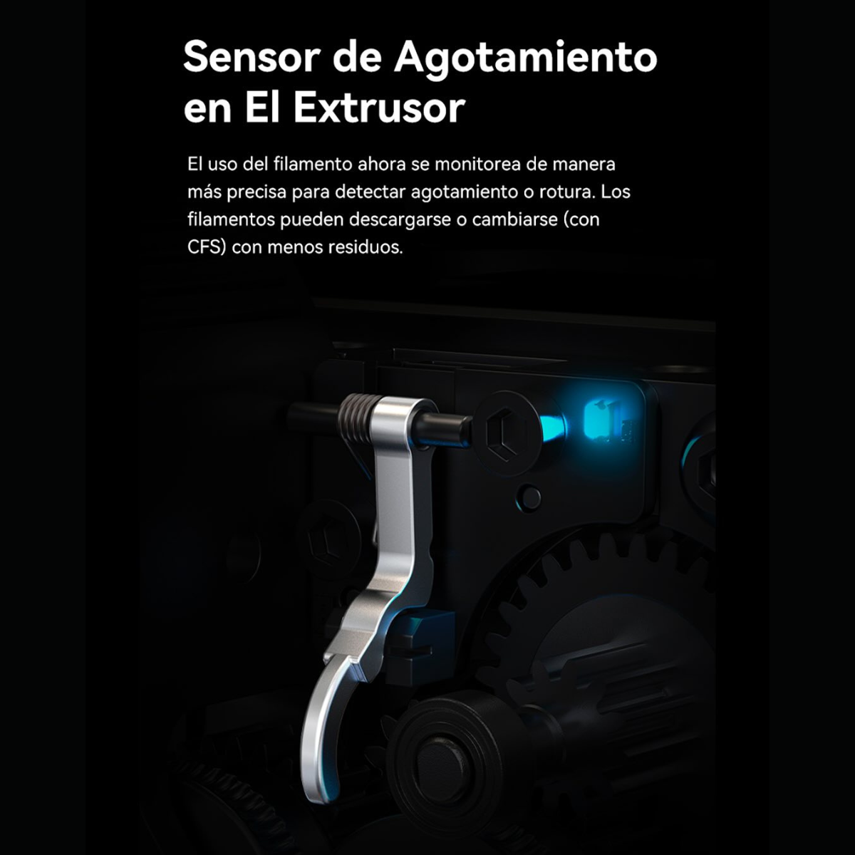 Sensor de Agotamiento en El Extrusor: El uso del filamento ahora se monitorea de manera más precisa para detectar agotamiento o rotura. Los filamentos pueden descargarse o cambiarse (con CFS) con menos residuos.