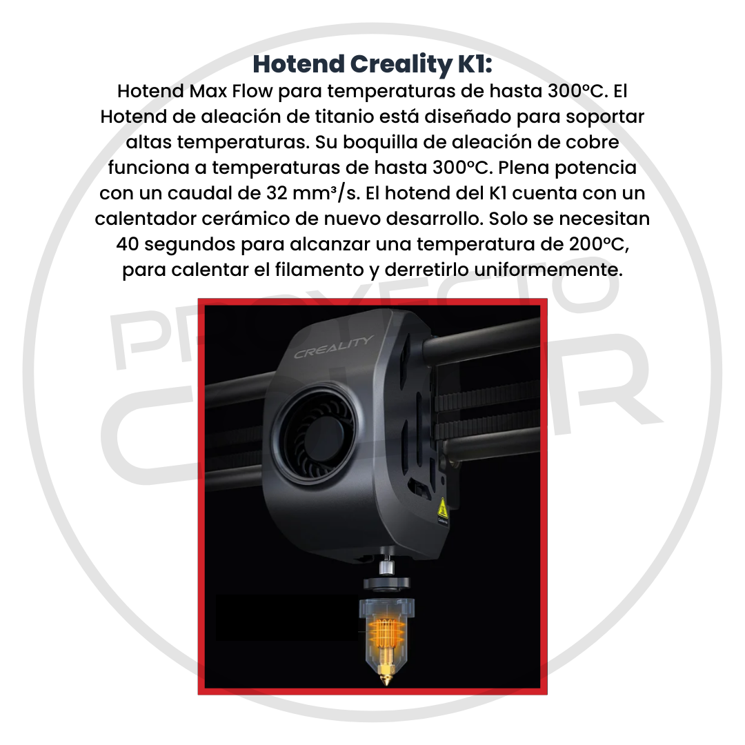 Hotend Creality K1: Hotend Max Flow para temperaturas de hasta 300°C. El Hotend de aleación de titanio está diseñado para soportar altas temperaturas. Su boquilla de aleación de cobre funciona a temperaturas de hasta 300°C. Plena potencia con un caudal de 32 mm³/s. El hotend del K1 cuenta con un calentador cerámico de nuevo desarrollo. Solo se necesitan 40 segundos para alcanzar una temperatura de 200°C, para calentar el filamento y derretirlo uniformemente.