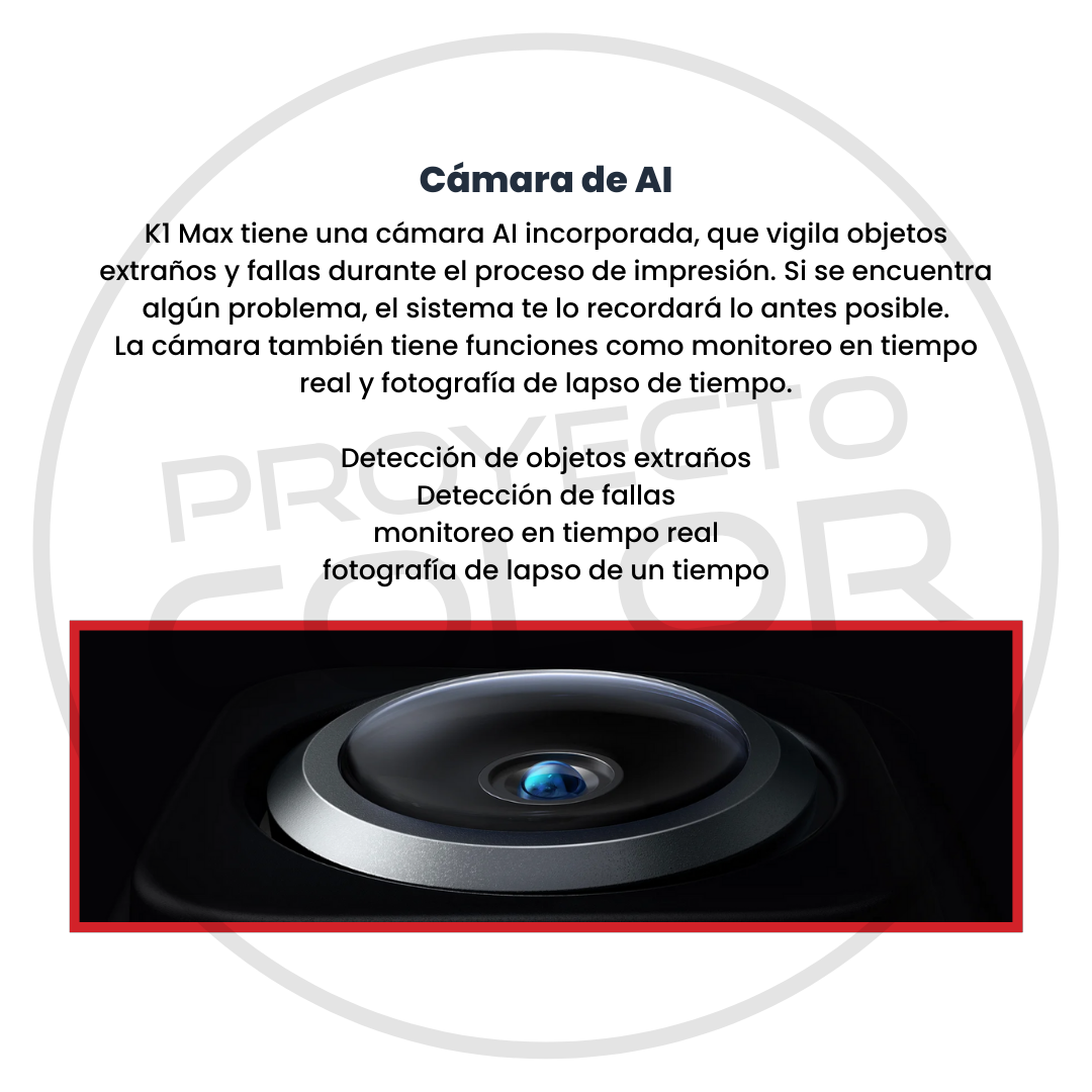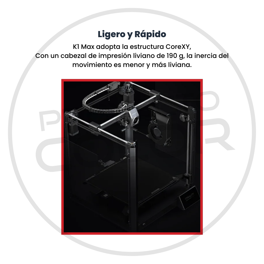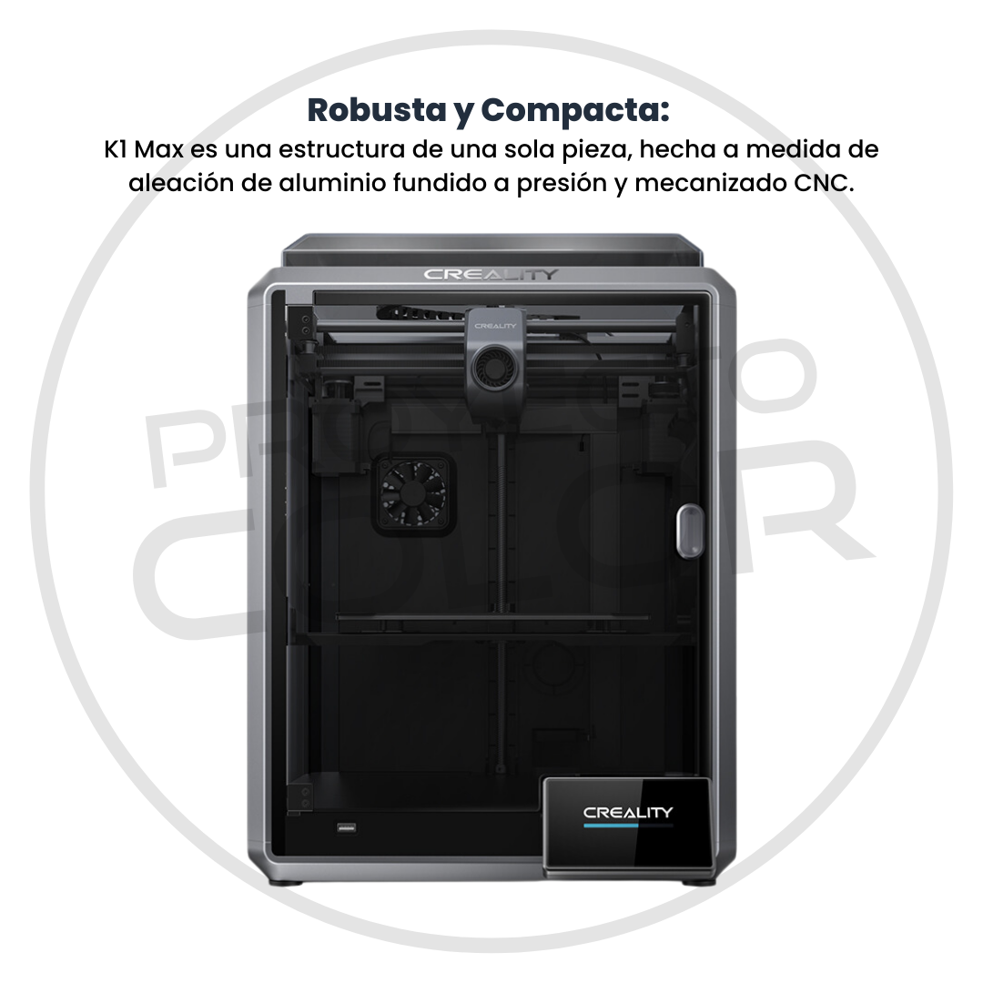 La Creality K1 MAX es una potente impresora 3D FDM de Gama Alta con una estética extremadamente atractiva y dimensiones compactas, con un volumen de impresión de 300 x 300 x 300 mm. La construcción estable permite que la impresora alcance velocidades de impresión extremadamente altas con una calidad excelente. K1 es una estructura de una sola pieza, hecha a medida de aleación de aluminio fundido a presión y mecanizado CNC. La impresora 3D Creality K1 viene completamente montada y lista para usar. La K1 es 12 veces más rápida que una impresora 3D FDM normal. El Hotend de aleación de titanio está diseñado para soportar altas temperaturas. Compatible con ABS, PLA, PETG, PET, TPU, PA, ABS, PC, PLA-CF, PA- CF, PET-CF y muchos más. El cabezal de impresión de la K1 está equipado con un sensor de aceleración especial que monitorea los patrones de vibración mecánica que ocurren durante movimientos extremadamente rápidos. G-sensor integrado en el cabezal de impresión, las frecuencias resonantes se miden automáticamente durante la impresión a alta velocidad y se reducen según sea necesario. De esta forma se reducen los ruidos agudos a velocidades altas. Nivelación Automática, sensores de tensión están integrados en la base calefactable para generar una malla de nivelación precisa.. Incluye Sensor Micro Lidar y Camara IA.