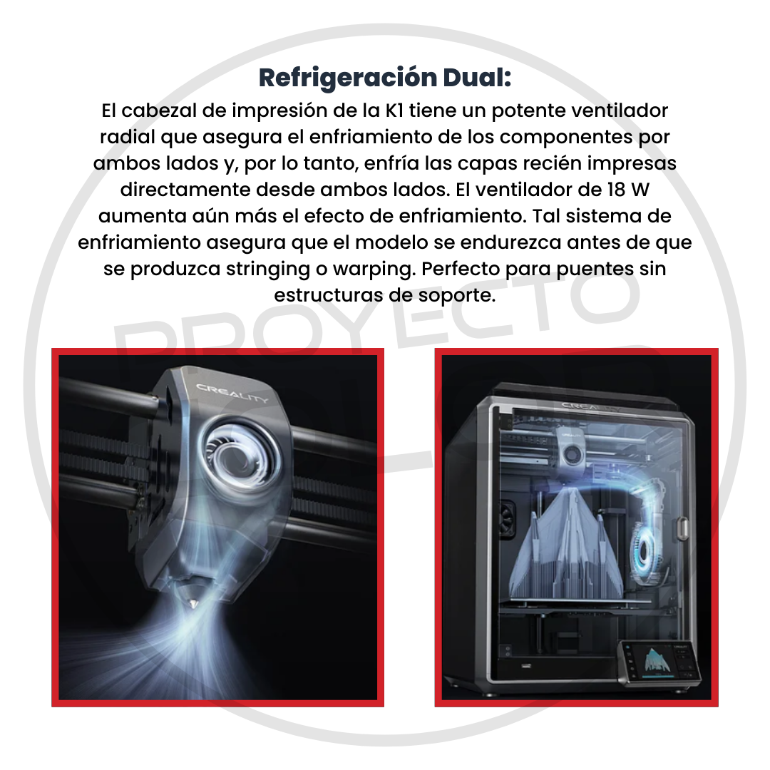 Refrigeración Dual: El cabezal de impresión de la K1 tiene un potente ventilador radial que asegura el enfriamiento de los componentes por ambos lados y, por lo tanto, enfría las capas recién impresas directamente desde ambos lados. El ventilador de 18 W aumenta aún más el efecto de enfriamiento. Tal sistema de enfriamiento asegura que el modelo se endurezca antes de que se produzca stringing o warping. Perfecto para puentes sin estructuras de soporte.
