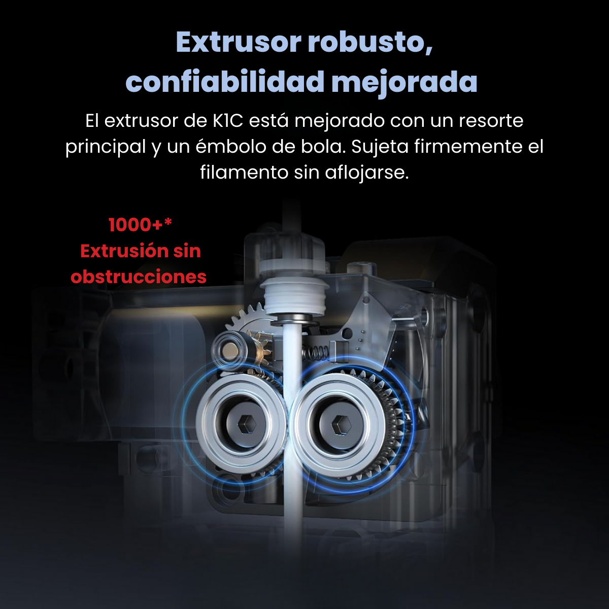 Rendimiento mejorado con filamentos de fibra de carbono: La Creality K1C viene equipada con un sistema de extrusión totalmente metálico , demostrando ser una auténtica bestia alimentadora de filamentos.