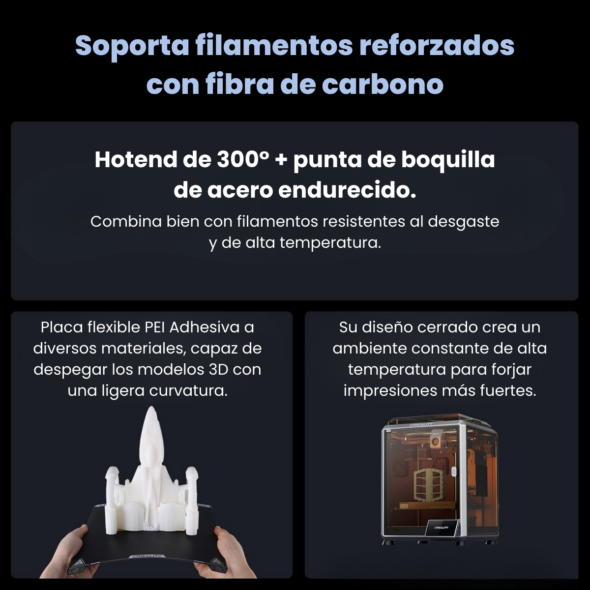 - Filamentos compatibles: ABS, PLA, PETG, PET, TPU, PA, ABS, ASA, PC, PLA-CF, PA-CF, PET-CF