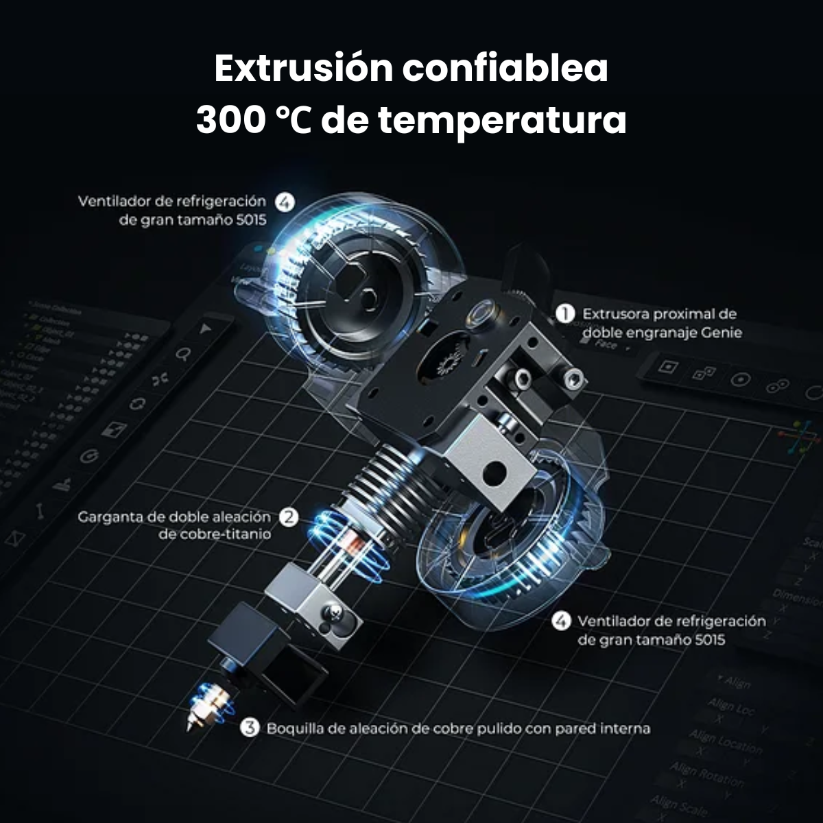 Extrusión confiable a una temperatura de 300 ℃: Extrusora directa de doble engranaje «Sprite» + rotura de calor bimetálica (aleación de cobre + aleación de titanio) + boquilla de aleación de cobre con pulido interior + ventilador de refrigeración 5015