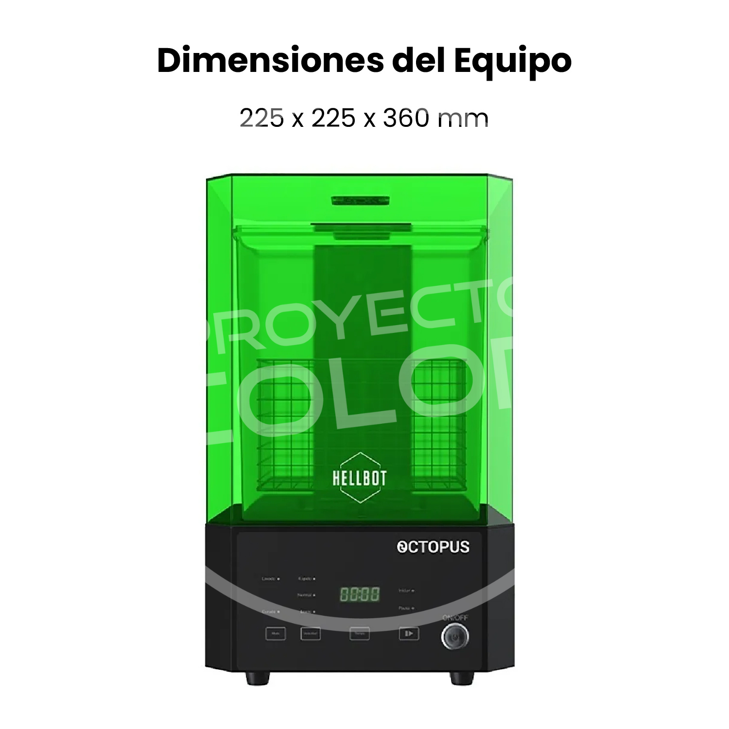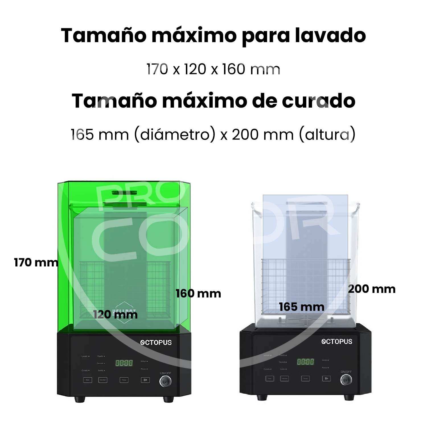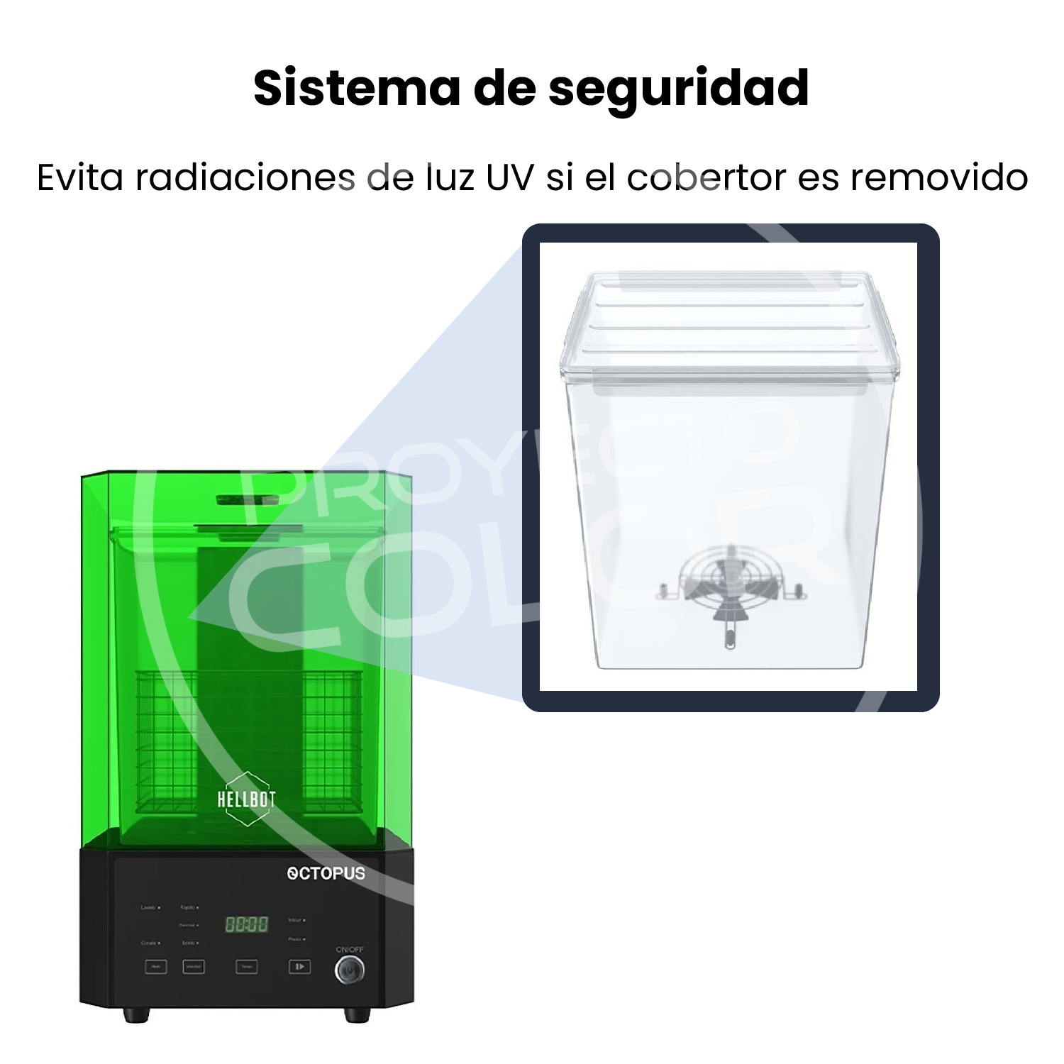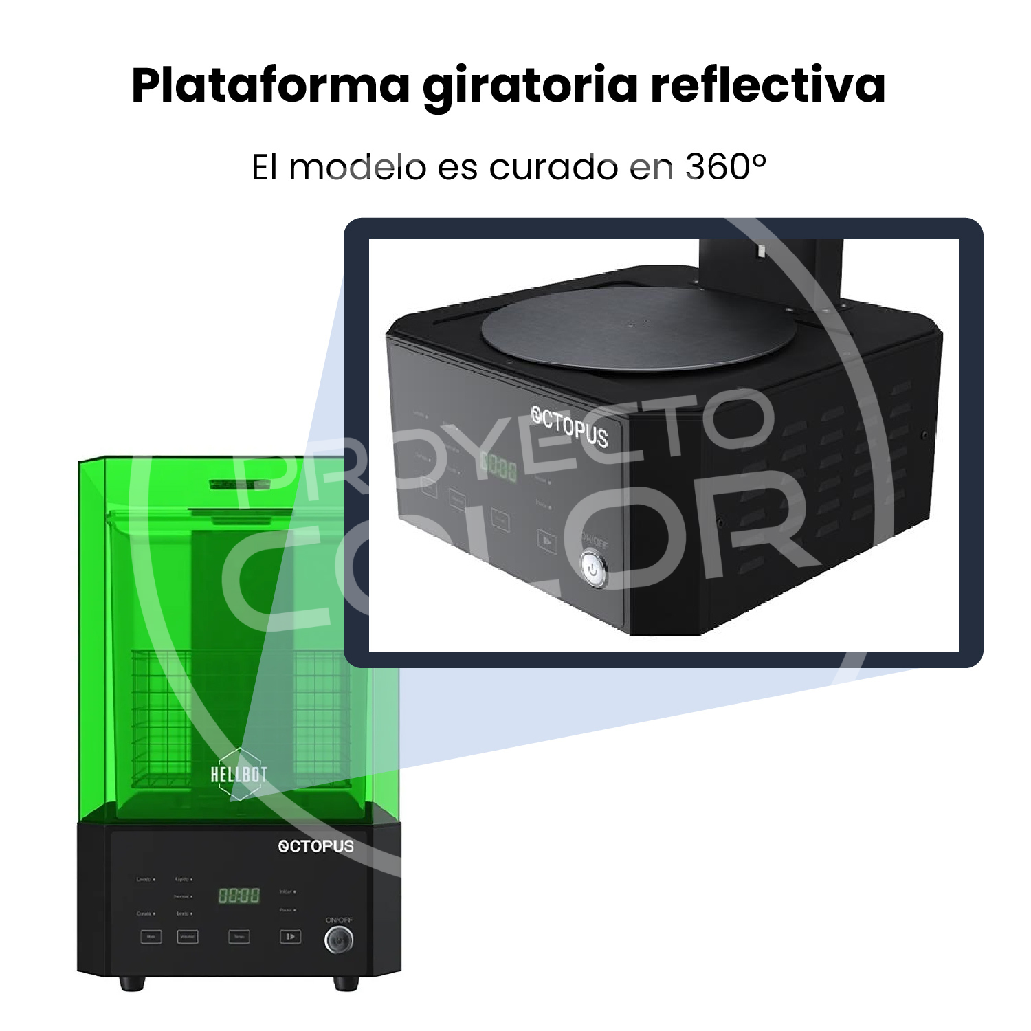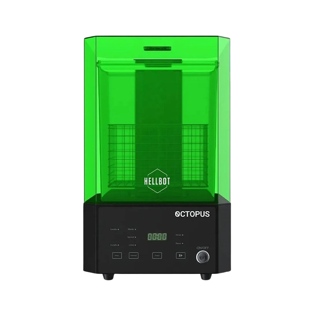 El postprocesado manual expone al usuario a la manipulación de resina al momento de lavar y curar los modelos impresos, con OCTOPUS evitarás al mínimo el contacto con este material.