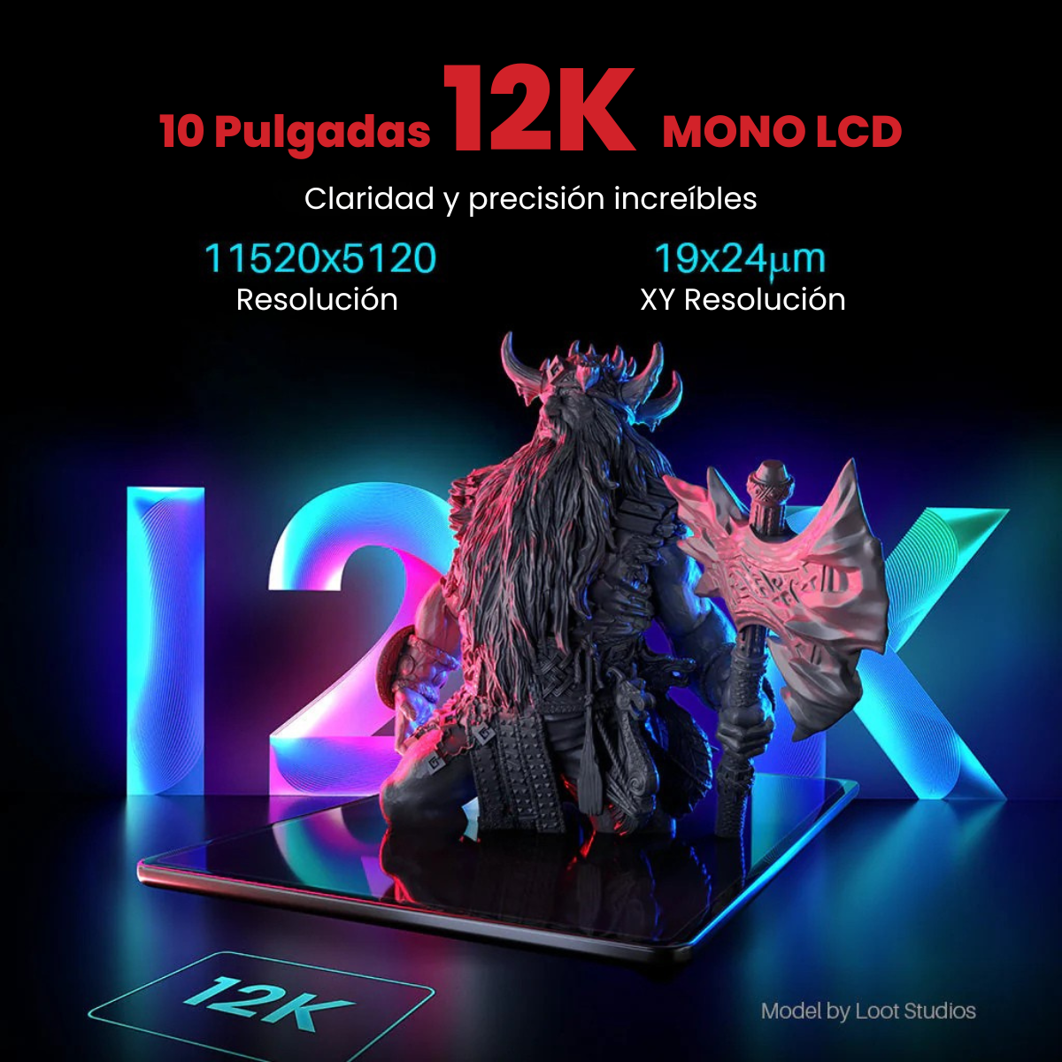 Resolución de 12K para superficies de modelos altamente detalladas: La Saturn 3 Ultra está equipada con una pantalla LCD monocromática de 10 pulgadas. Con una resolución LCD de 12 K (11520 x 5120 píxeles) y una resolución xy de 19 x 24 μm, la impresora de resina logra resultados increíbles con detalles nítidos incluso con modelos complicados. Un protector de pantalla de vidrio templado 9H a prueba de explosiones, resistente a la abrasión y a los arañazos garantiza que la pantalla LCD esté protegida contra arañazos y daños por fugas o penetración de resina.