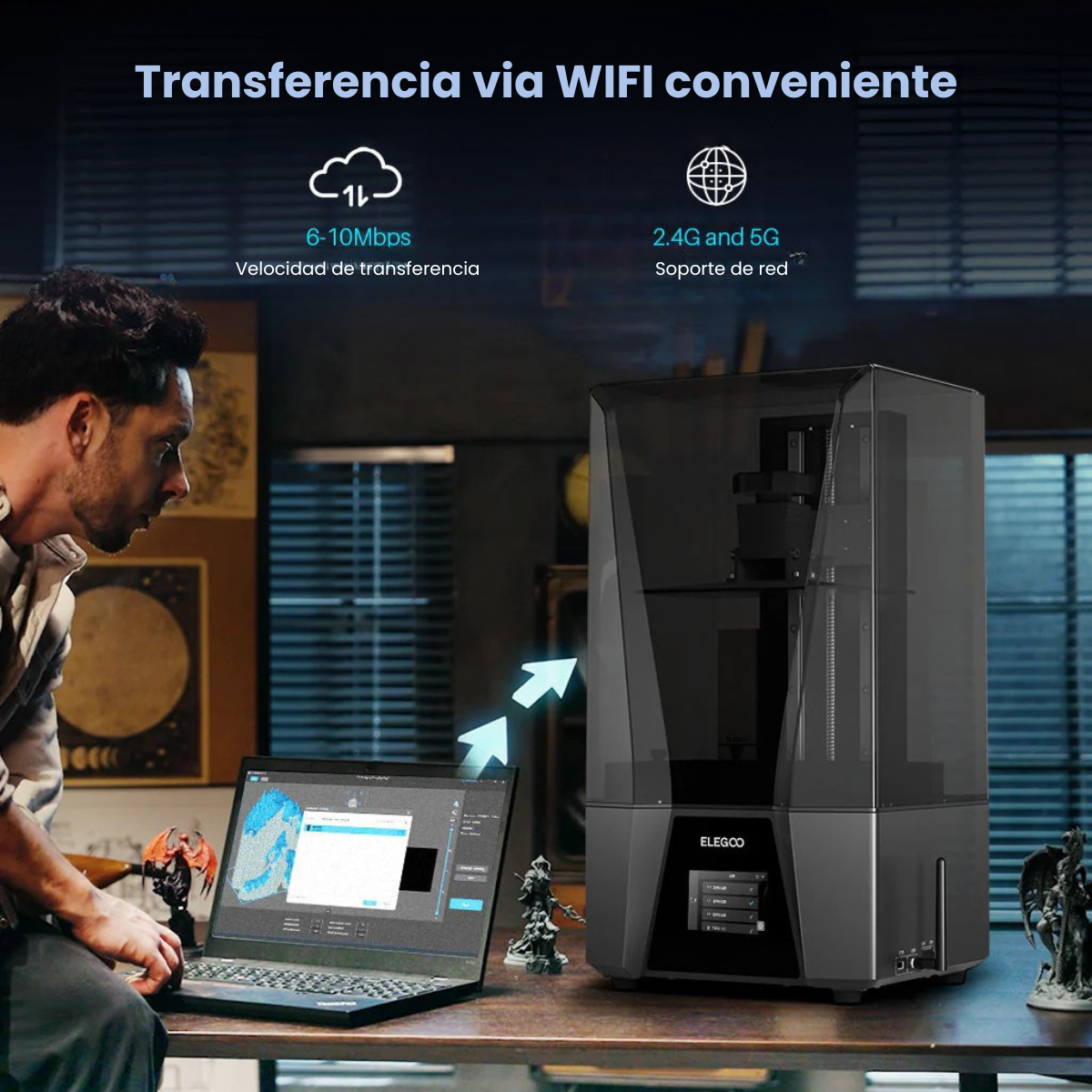 Transferencia de datos a través de WiFi: Además de USB, la Saturn 3 Ultra admite transmisión de datos a través de WiFi y es compatible con redes 2.4G y 5G. Los archivos se pueden transferir desde un teléfono inteligente y una PC a una velocidad de 6-10 M/s. También hay una antena desmontable en el lado derecho de la impresora.