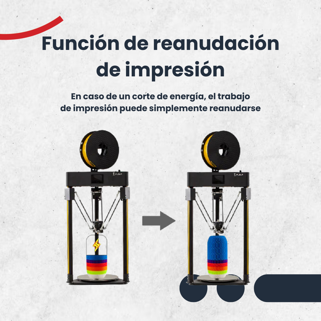El potente extrusor Titan es compatible con muchos filamentos habituales del mercado, especialmente indicado para filamentos duros como el PLA. Q5 utiliza una pantalla táctil TFT de 2,4 pulgadas, compatible con 7 cambios de idioma de visualización, función de calentamiento de una tecla PLA/ABS integrada. Para comenzar a imprimir, simplemente ensambla la Q5 usando algunos tornillos y conectando algunos cables. Con un volumen de construcción de Ø 200 x 200 mm, la FLSUN Q5 permite imprimir modelos de tamaño pequeño y mediano. Con la nivelación automática de la cama de impresión, se registran 27 puntos en la cama de impresión a tiempo real. Una placa base de 32 bits ofrece un rendimiento mejor y más estable. Con un controlador TMC2208 silencioso, la impresora 3D funciona casi sin ruido. Las impresoras Delta 3D son conocidas por sus altas velocidades de impresión. La FLSUN Q5 imprime a velocidades de hasta 120 mm/s. Una pantalla táctil a color de 2,4 pulgadas con una nueva interfaz de usuario y numerosas configuraciones de idioma permite una fácil gestión y supervisión de la impresión. En caso de un corte de energía, el trabajo de impresión puede simplemente reanudarse donde lo dejaste. La plataforma de impresión caliente permite imprimir una amplia variedad de materiales y mejora la adherencia del modelo a la plataforma de impresión.