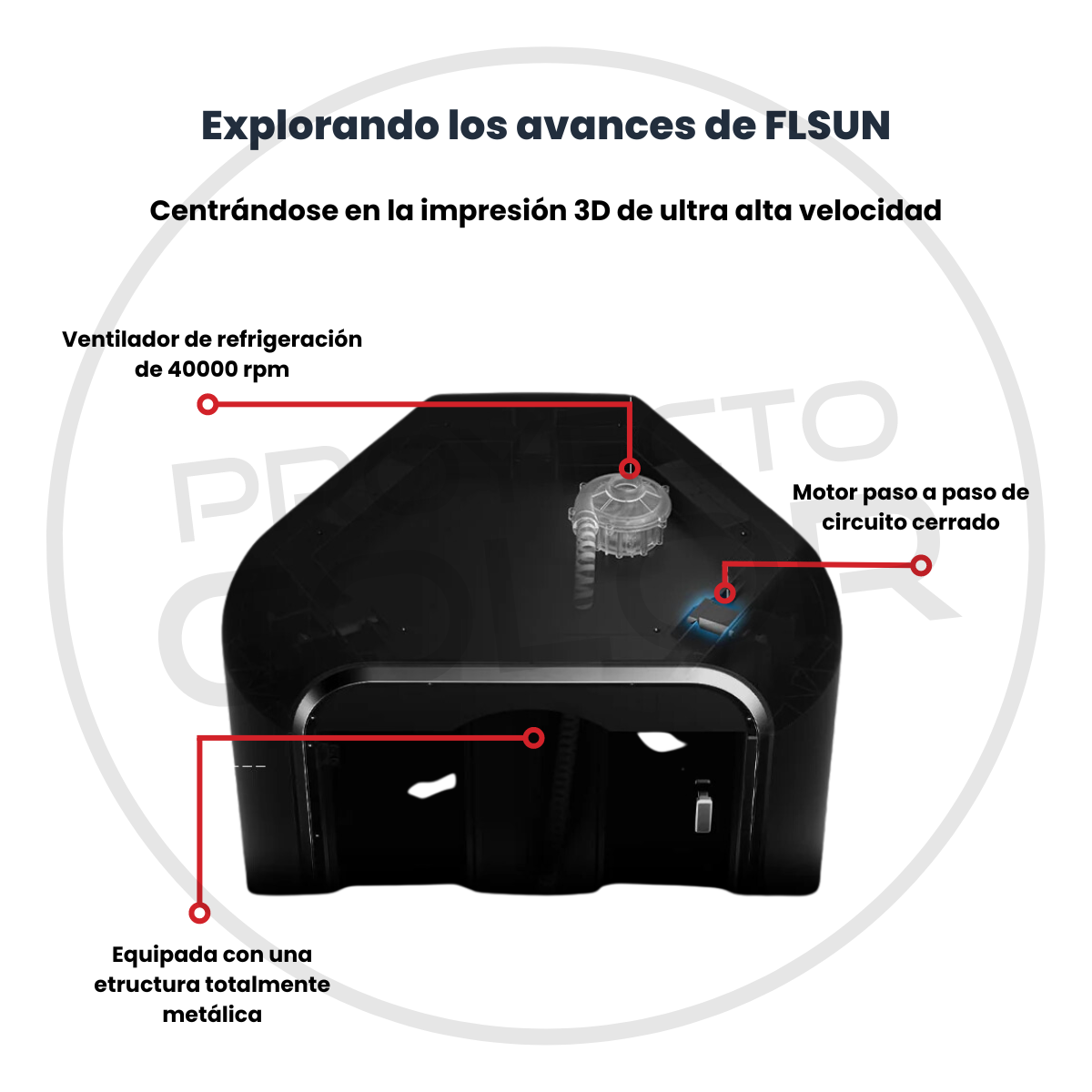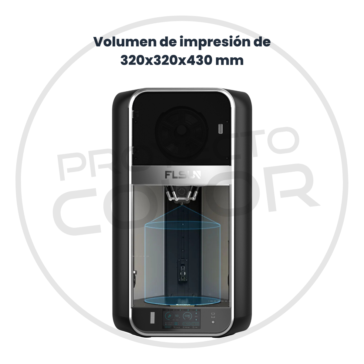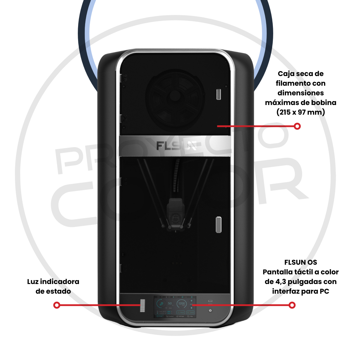 Otras características: Luz para visualización de estado. Pantalla táctil de integración total con interfaz de PC. Suspensión automática de pantalla. Apagado automático de la impresora. Sistema operativo Flsun. Caja seca del filamento. Smart Zone Heating con un diámetro del círculo interior de 220 mm, un diámetro del anillo exterior de 220-320 mm, para una temperatura del cama de 120 °C como máximo. Plataforma de impresión texturizado de PEI. Power Off Resume Print-Function. Filtro de aire HEPA con carbón activo.