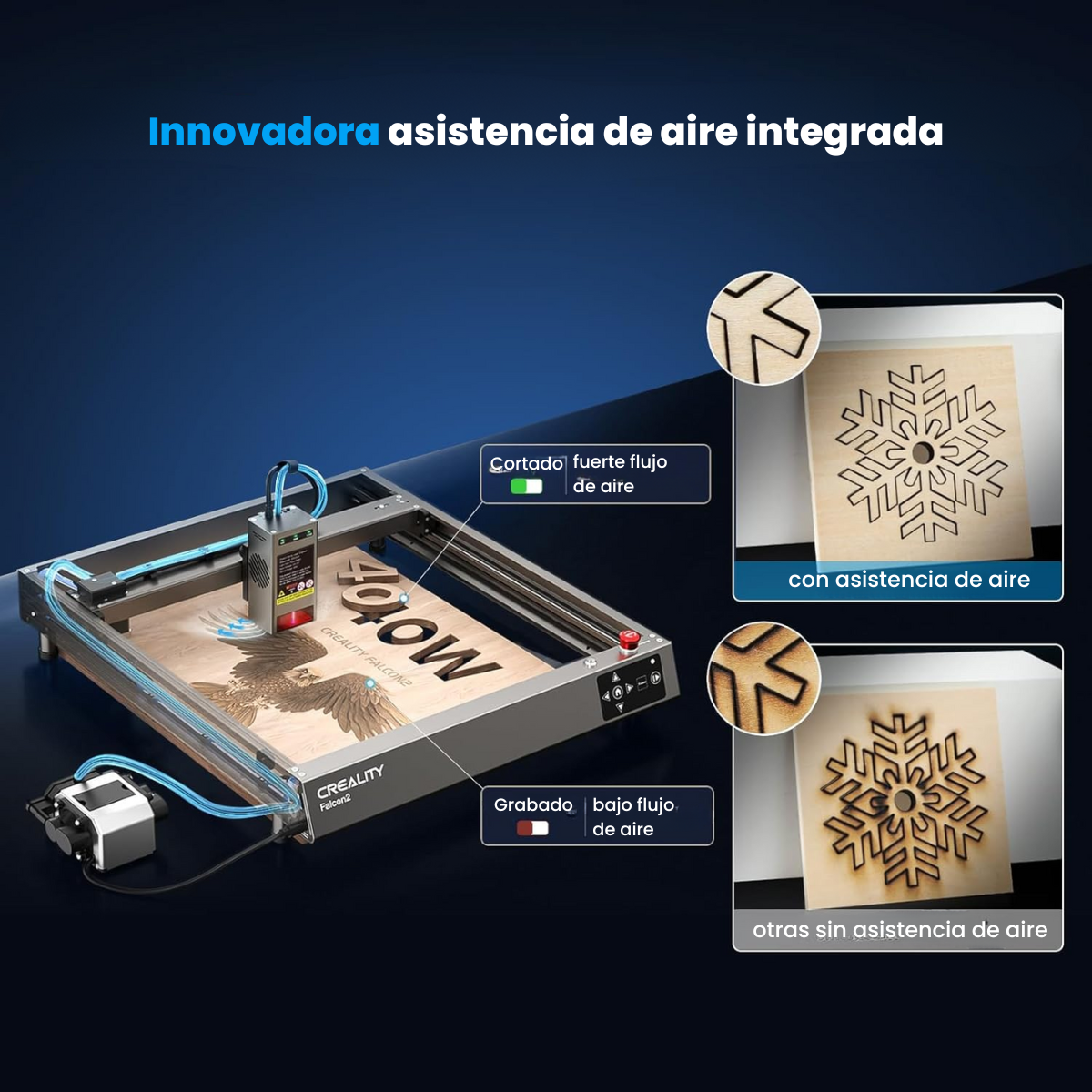 Otra característica importante de la CR-Laser Falcon2 es su sistema de ayuda de aire integrado. Este sistema innovador ayuda a mejorar la calidad de corte y grabado y protege la lente del cabezal láser. El sistema de ayuda de aire integrado puede ajustar automáticamente el flujo de aire a través de LightBurn y, de esta manera, eliminar los residuos de material y la acumulación de polvo y suciedad que pueden afectar la calidad del resultado final. Además, el sistema de ayuda de aire integrado de la CR-Laser Falcon2 es único en que se puede ajustar manualmente a cualquier velocidad, lo que permite a los usuarios personalizar el flujo de aire de acuerdo con sus necesidades específicas.